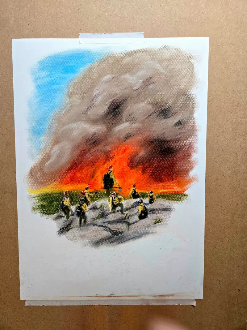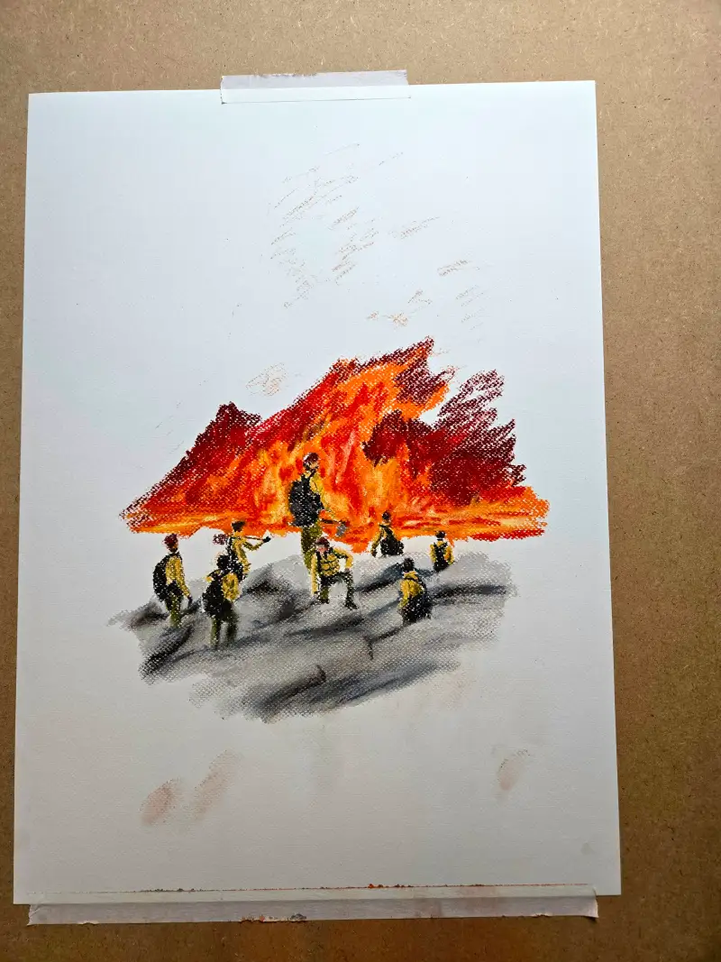 대략적으로 불의 경계선과 바위를 소프트파스텔로 채색해주고