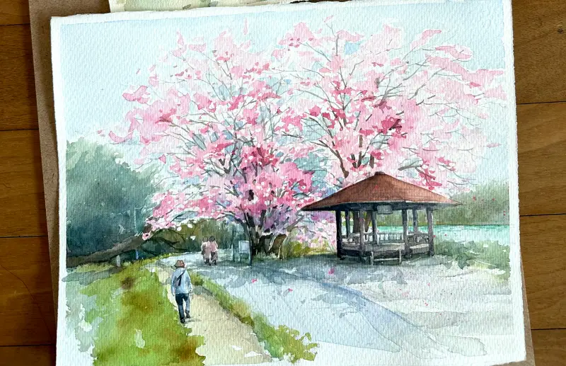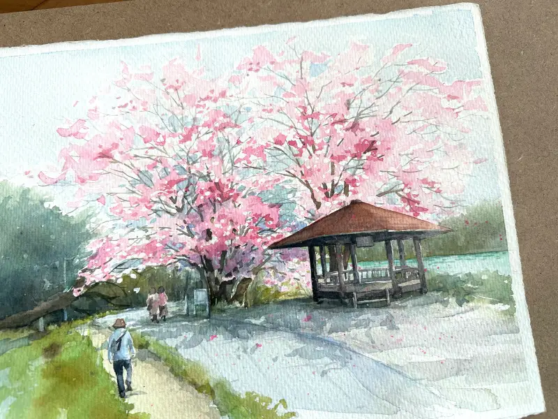 멀리서 본 벚꽃나무를 사진보고 그려보았어요.