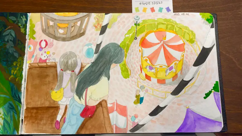수채화로 풍선 비행하며 보는 놀이공원 풍경을 그려봤습니다. 귀찮음 이슈로 손님이 많이 없지만..^^