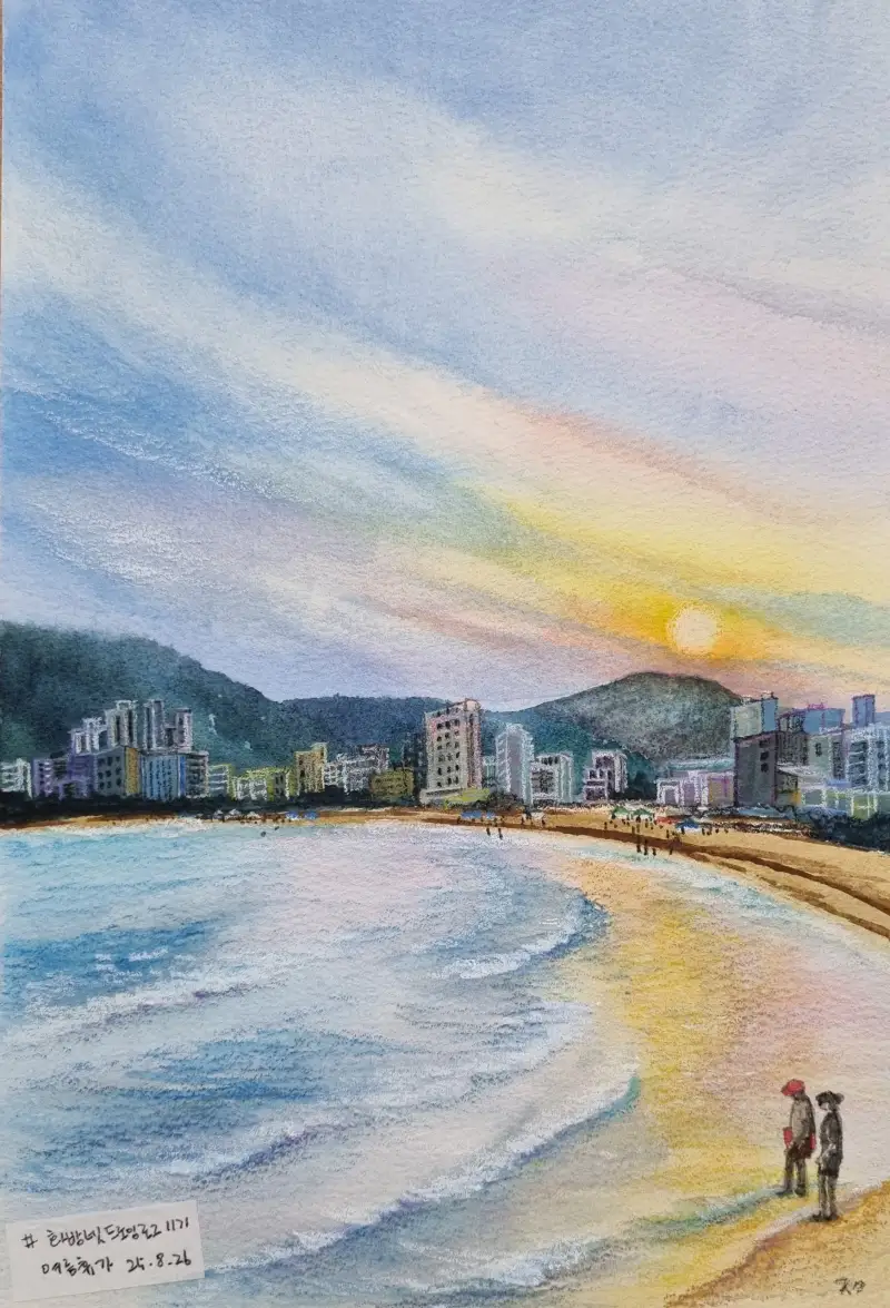 이번 그림은 스케치 없이 수채물감으로 하늘과 바다 분위기 표현해주고 마른 후 산과 건물 면들 채색
