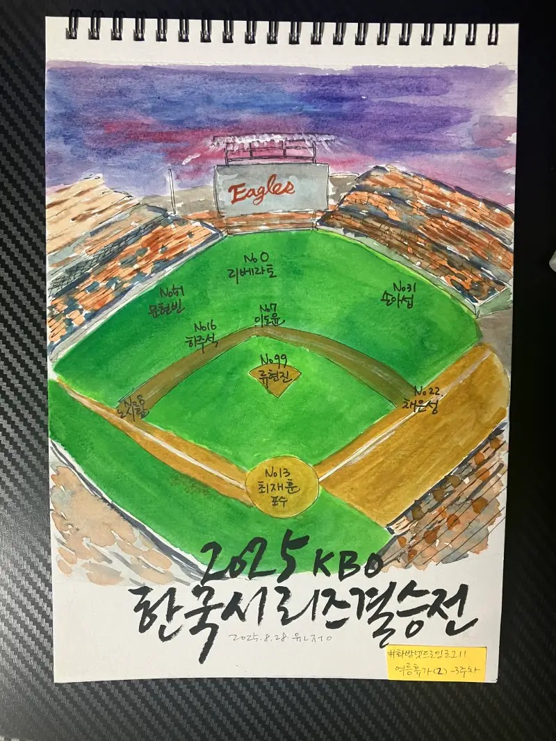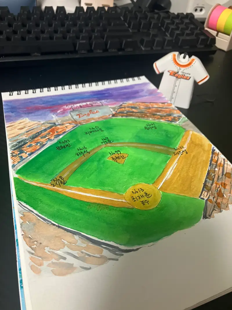 그래서 한국시리즈 가는걸 상상하며, 야구장에서 응원하는 제 모습을 상상하며 그혀봤습니다.