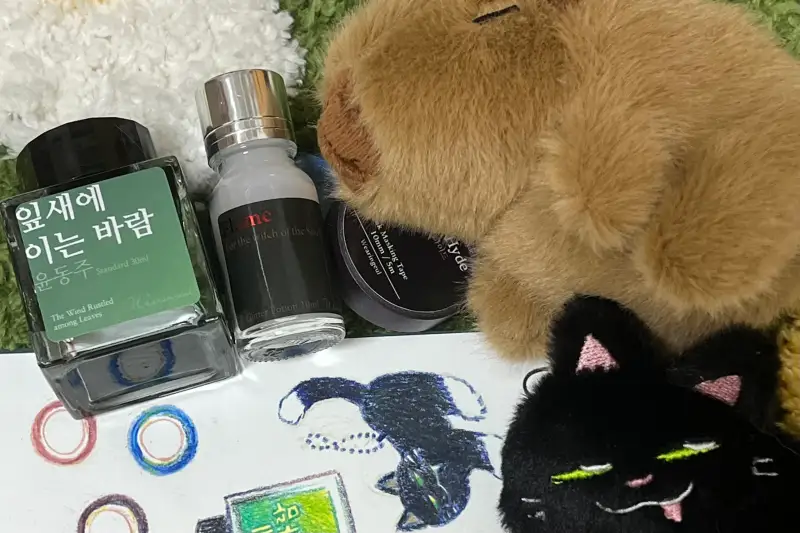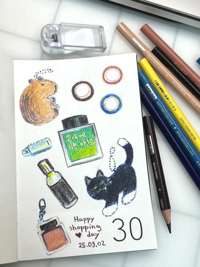 오늘 쇼핑하면서 흥미로운 그림 재료 몇 가지와 친구들에게 줄 선물도 샀어요. 그래서 오늘 제 가방 속에는 바로 이런 것들이 있었고, 그걸 그리고 싶어졌어요.
