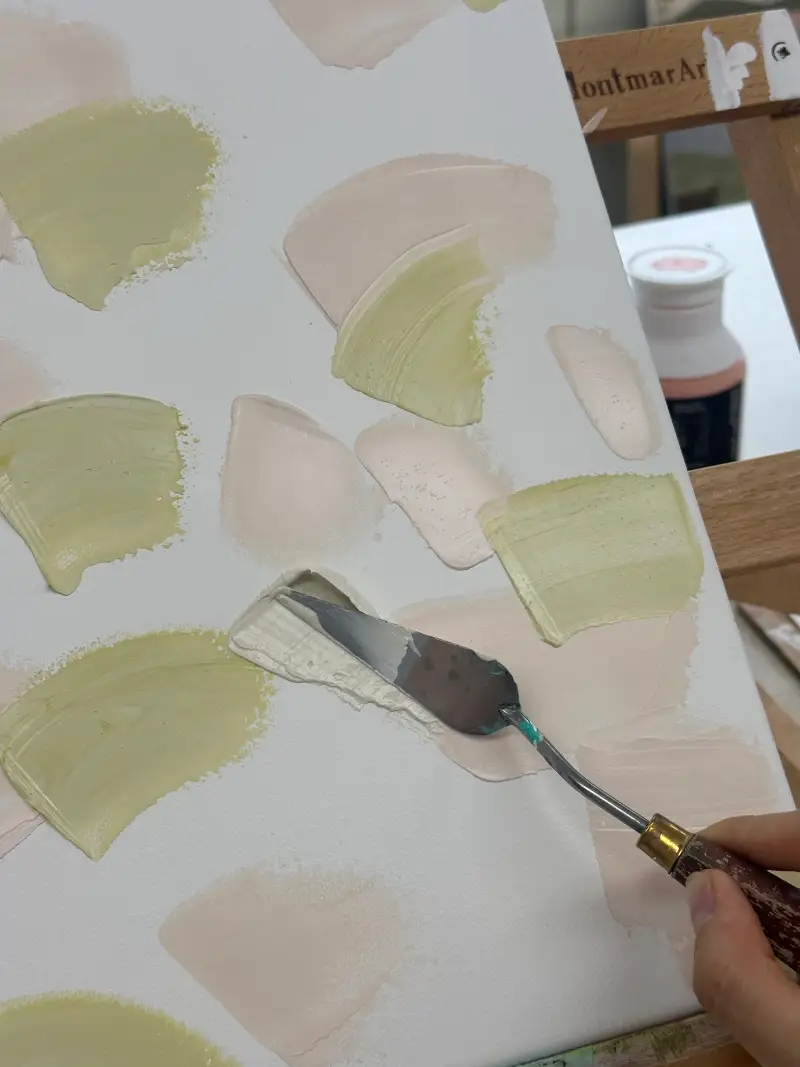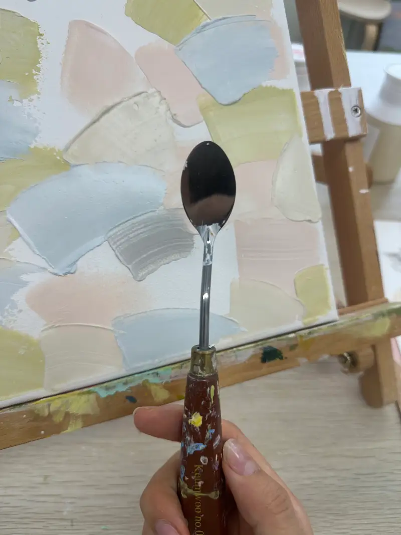 저는 중간크기의 나이프로 이용해 전체 면적을 깔고, 작은 모서리의 나이프로 꽃, 둥근 나이프로는 비눗방울을 표현해 봤어요 😊