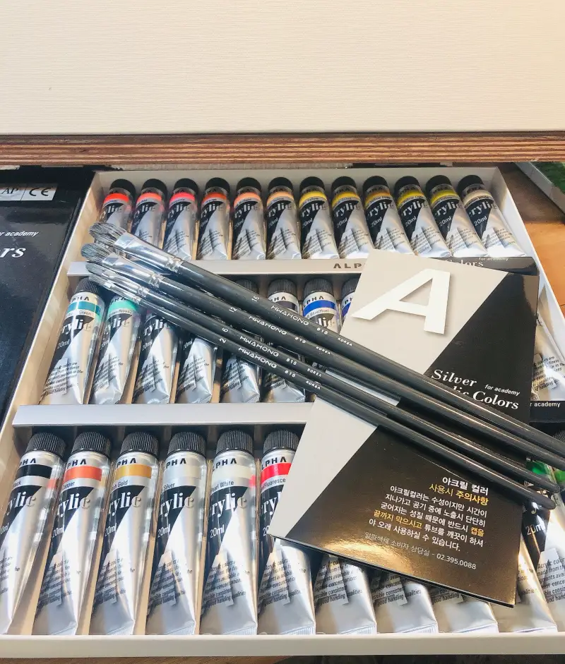 아크릴 물감은 알파브랜드로 크기도 커서 오래 쓸 수 있는 장점에 색감 발색력 모두 잘 만들어진 제품이라 쓸때마다 기분 좋게 쓰게 됩니다~