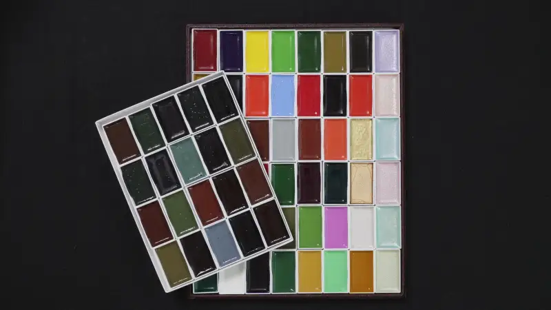 동양화 재료는 처음 사용해 봤는데 일단 고체 수채화 물감 형식과 같은 방식으로 제작되어 나와서