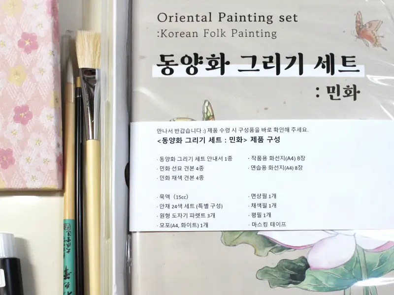 먹, 안채 24색 세트, 원형 도자기 파렛트 3개, 붓 3종류, 모포, 마스킹 테이프 뿐만 아니라 초보자도 쉽게 이해할 수 있는 동양화 그리기 세트 안내서와 작품용 화선지 8장, 연습용 화선지 8장, 민화 견본 (선화, 채색 4종씩)이 함께 구성되어 있어
