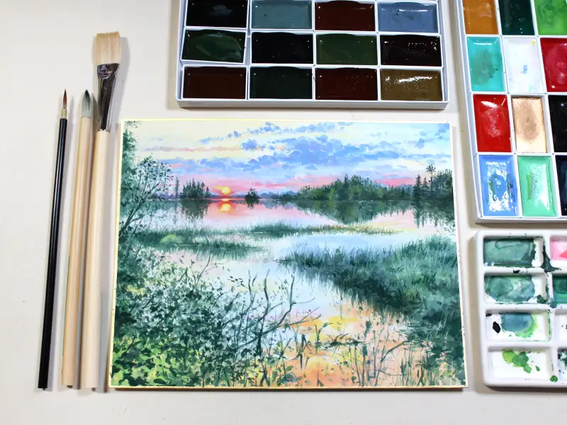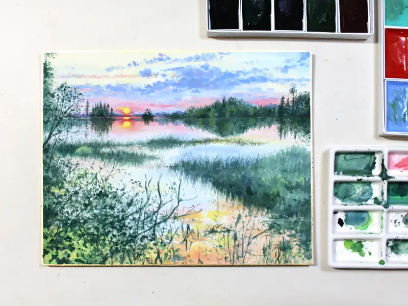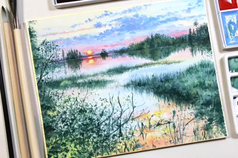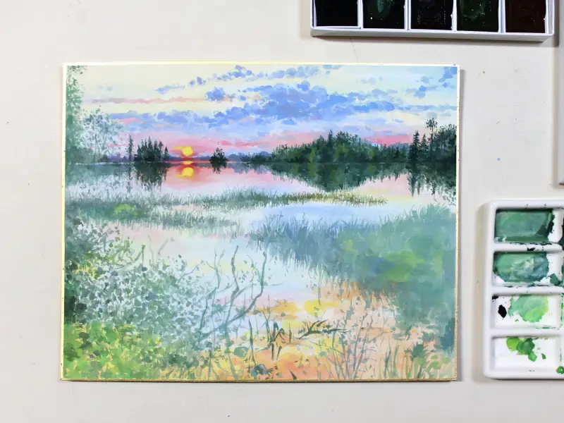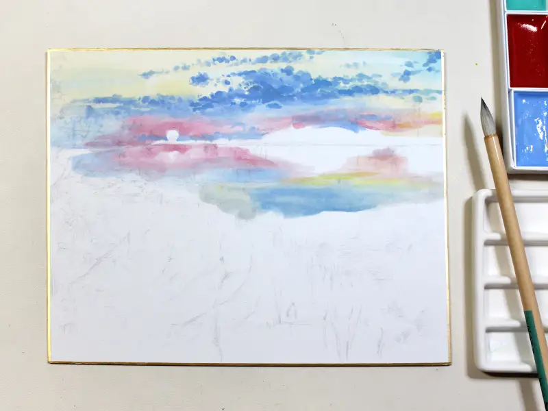 아직 다 마르지 않아 색들이 조금 어두운 느낌이지만 전체적으로 하늘과 강에 비친 하늘의 색감을 칠했습니다.