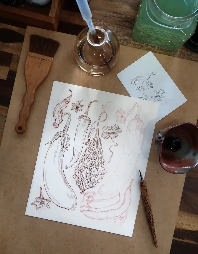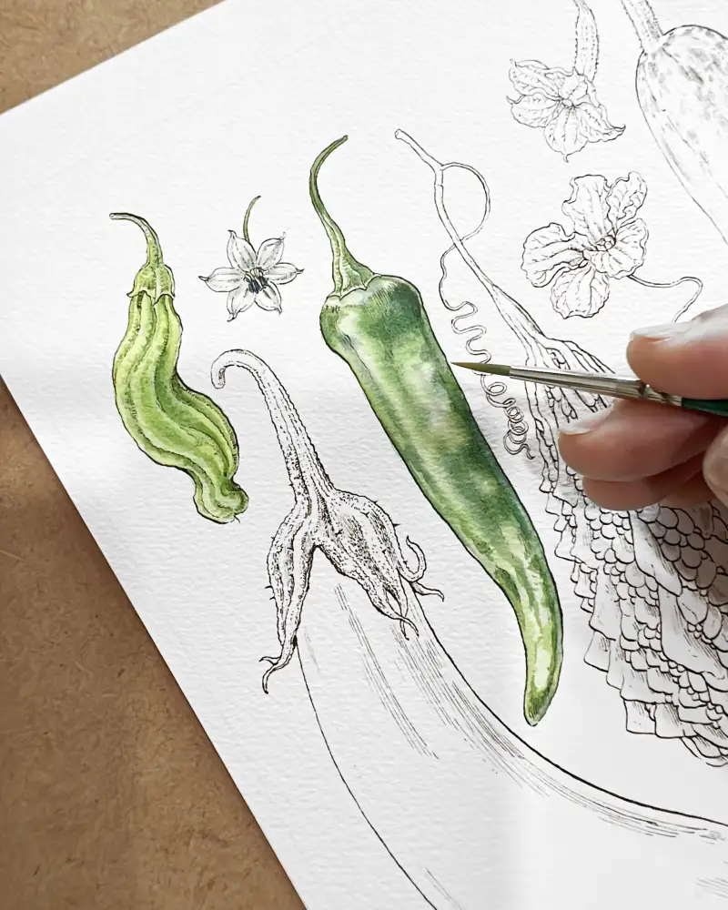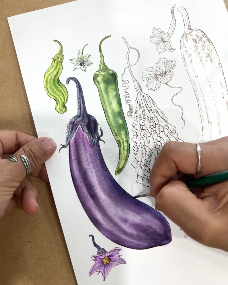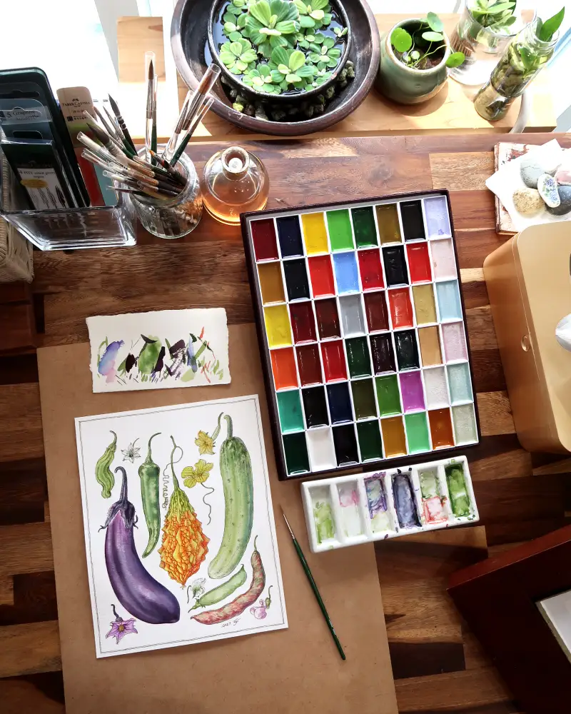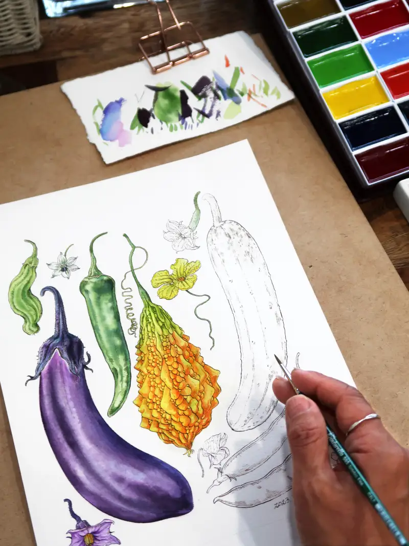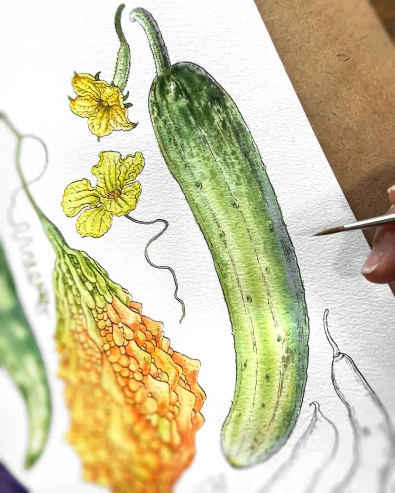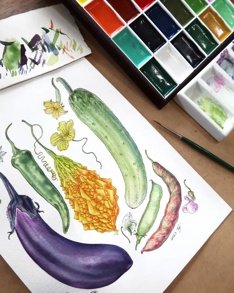 먼저 해 본 테스트에서 진한 발색과 아름다운 색채를 확인 후, 이 물감과 어울리는 주제를 그리고 싶어 나름 고민 좀 했습니다.  시골집 “여름 채소 열매모음” 입니다.