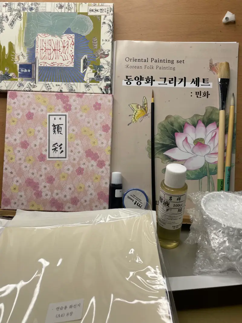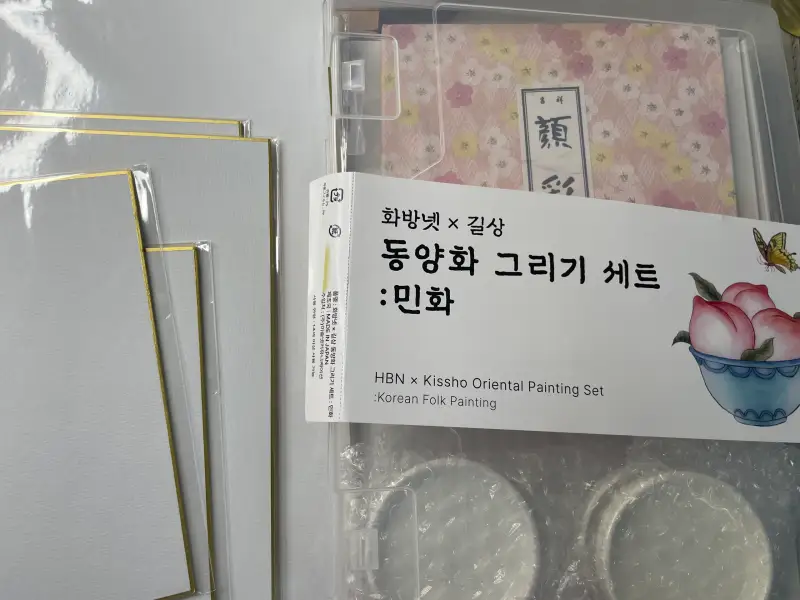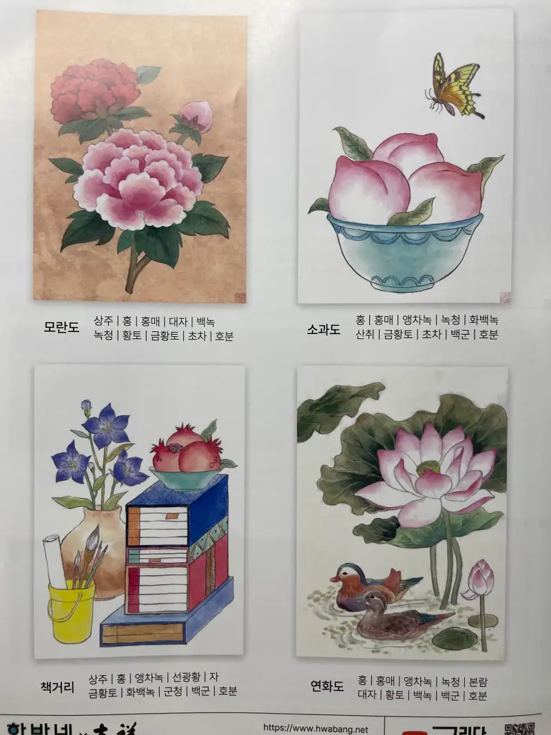 특히 안채 물감 24색은 레드 계열이 풍부해 꽃과 인물 표현에 탁월했고, 채미먹 20색은 먹 특유의 깊이를 유지하면서도 단조롭지 않게 색의 변주를 줄 수 있어서 유용했습니다. 작은 안내서에는 기본 기법(바림, 선화, 호분 등)이 친절하게 담겨 있어 초보자도 그대로 따라 하면 쉽게 완성작을 얻을 수 있는 점이 인상적이었습니다.