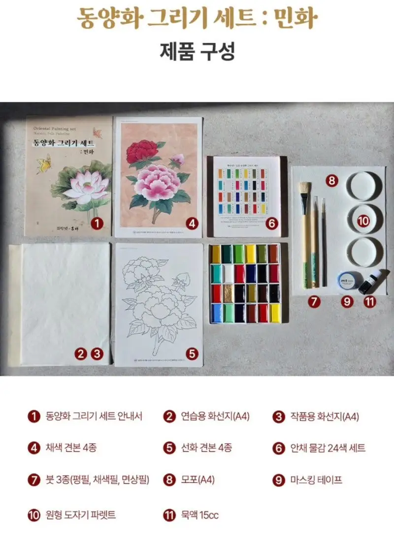 • 이번 키트는 길상 × 화방넷 MD 협업으로 입문자에게 실용적으로 구성된 동양화 그리기 세트입니다.