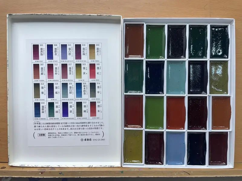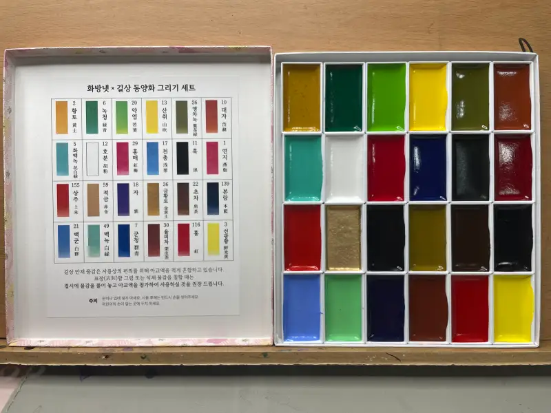 이번에 사용한 길상 안채 24색 세트 + 채미먹 20색은 동양화를 처음 접하는 분도 쉽게 접근할 수 있도록 구성된 알찬 키트였습니다.