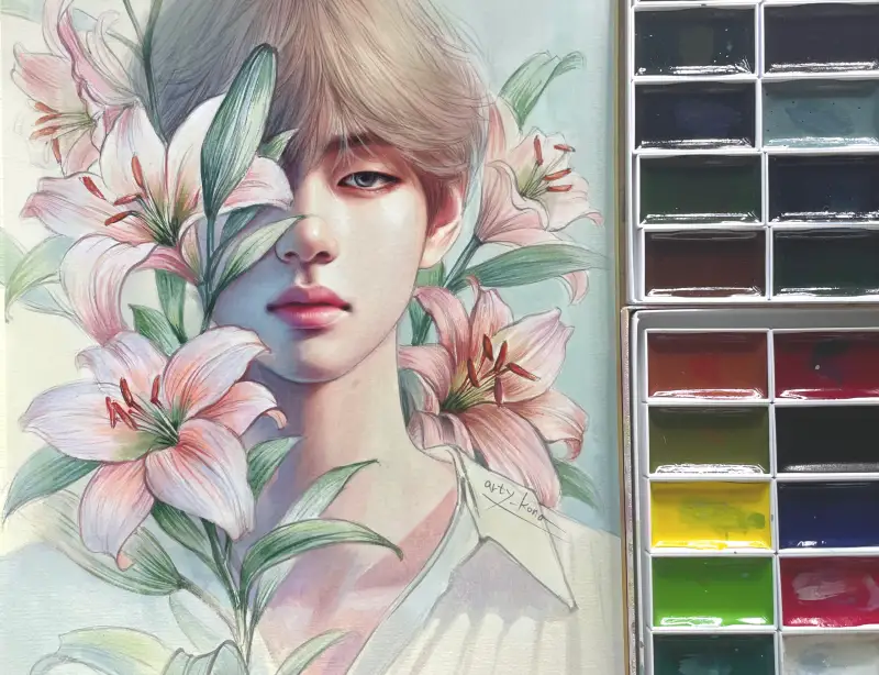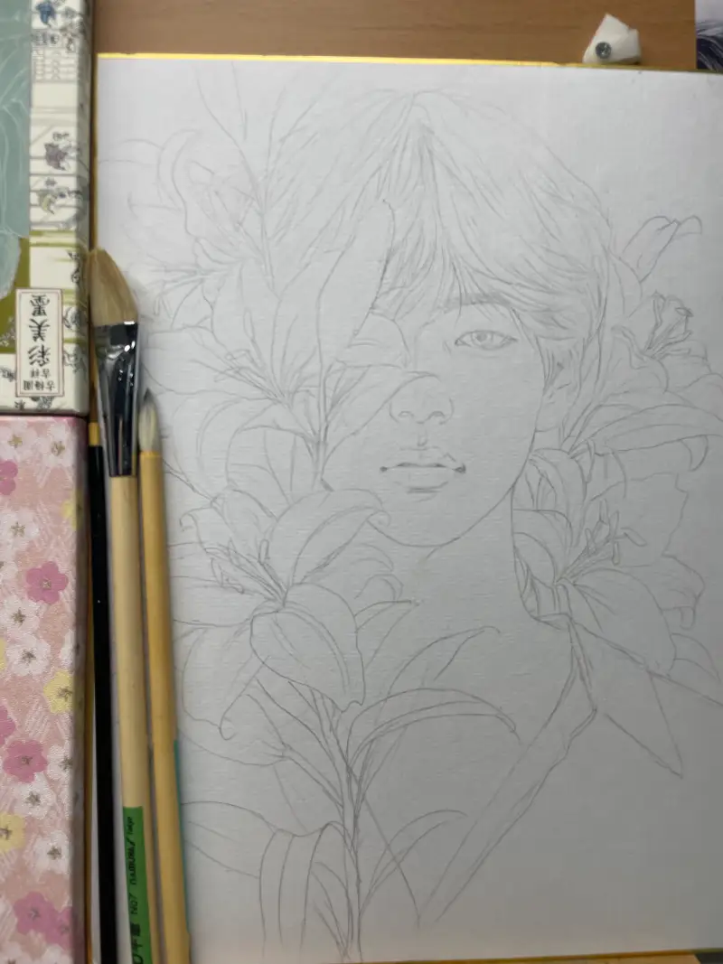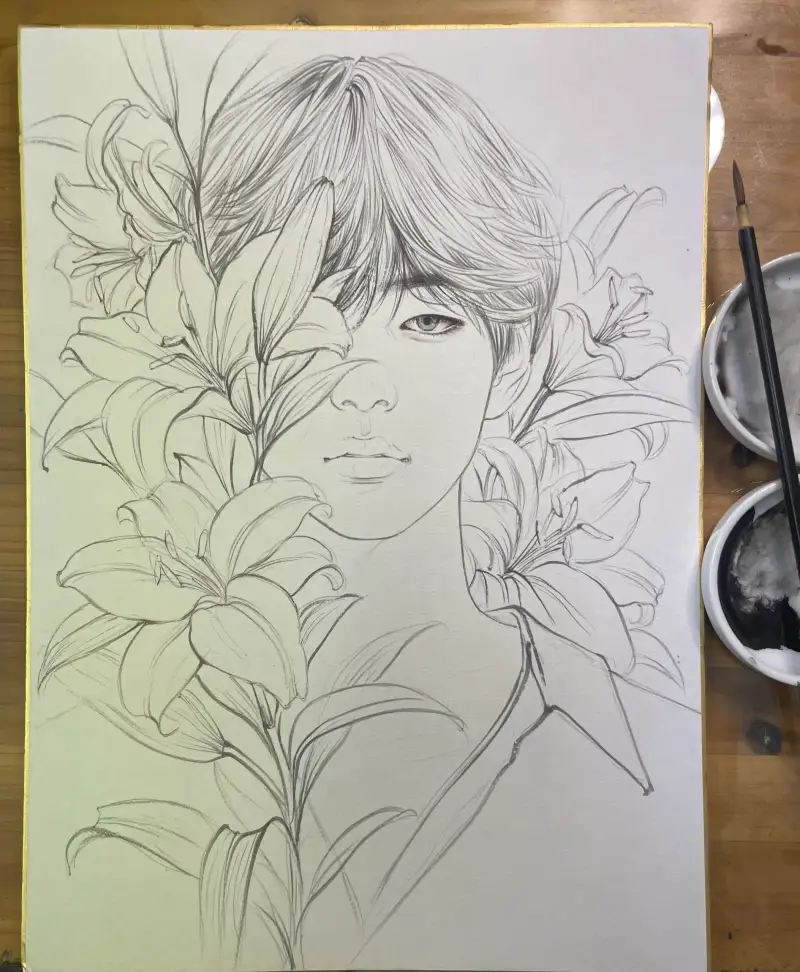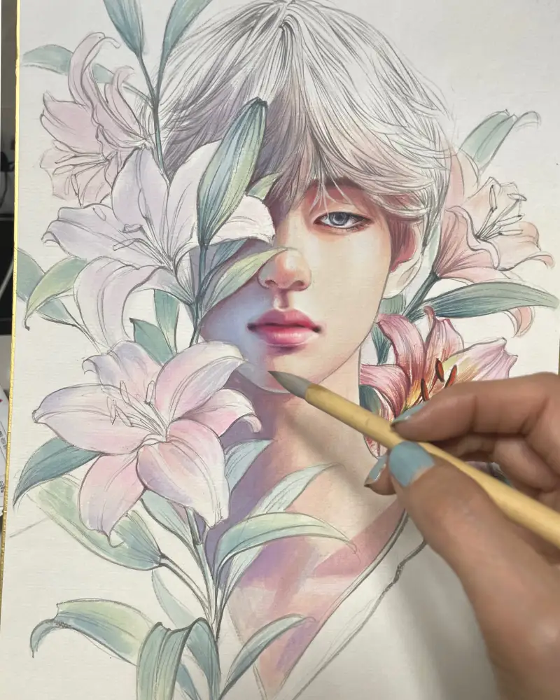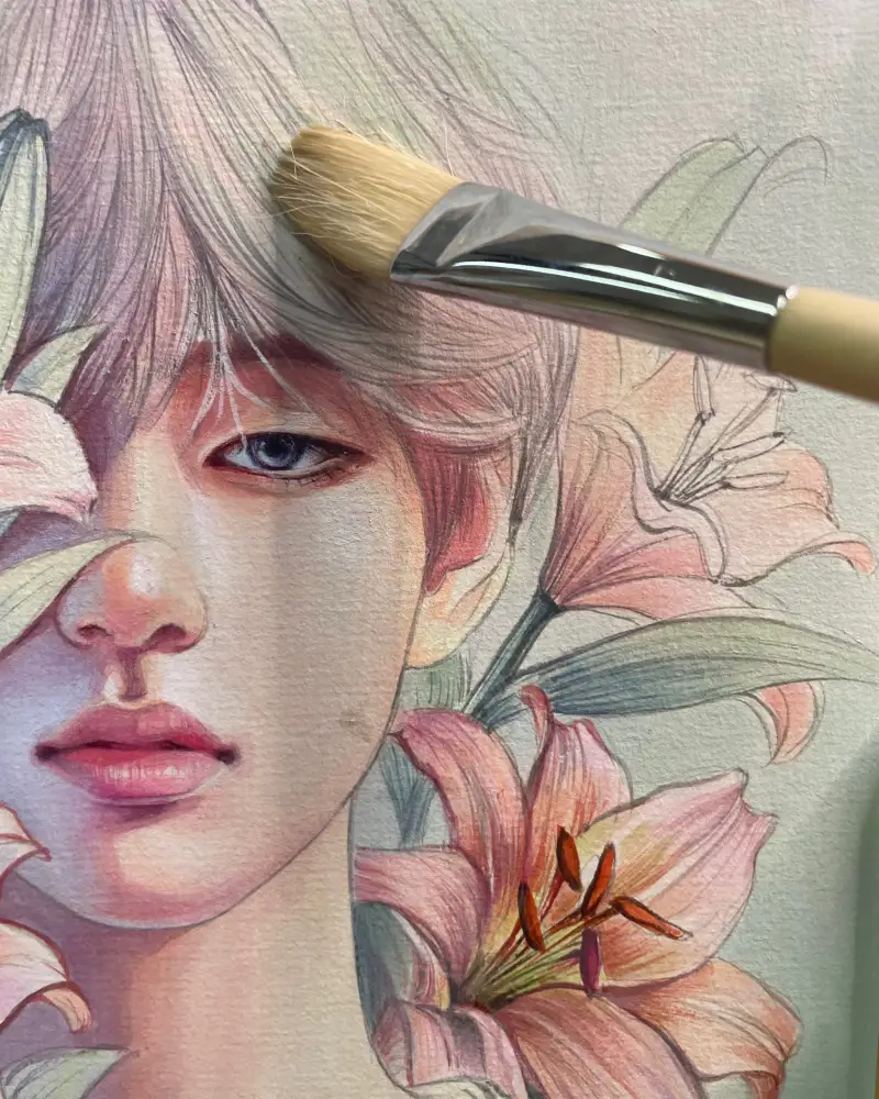 • 채미먹으로 눈동자·속눈썹·꽃의 미세한 음영 강화.
