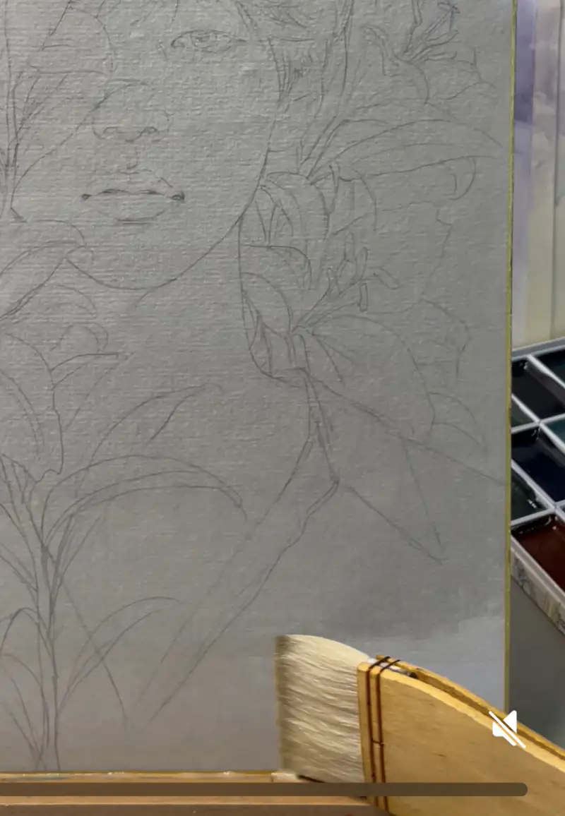 • 예: 얼굴의 주요 윤곽은 묵색 + 붉은기 살짝 섞은 선, 꽃은 남색/회녹 계열 먹으로.