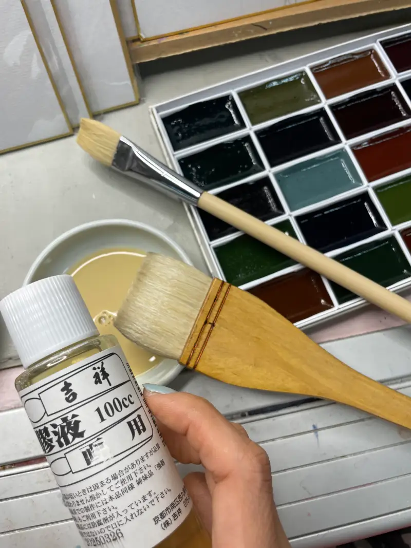 • 아교포수: 아교 1 : 물 10 비율 → 얇게 바탕칠해서 번짐 방지. 이후 농도를 점점 올리며 레이어링.