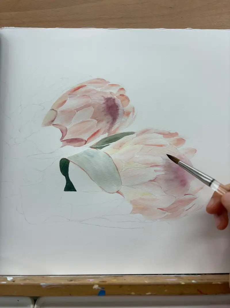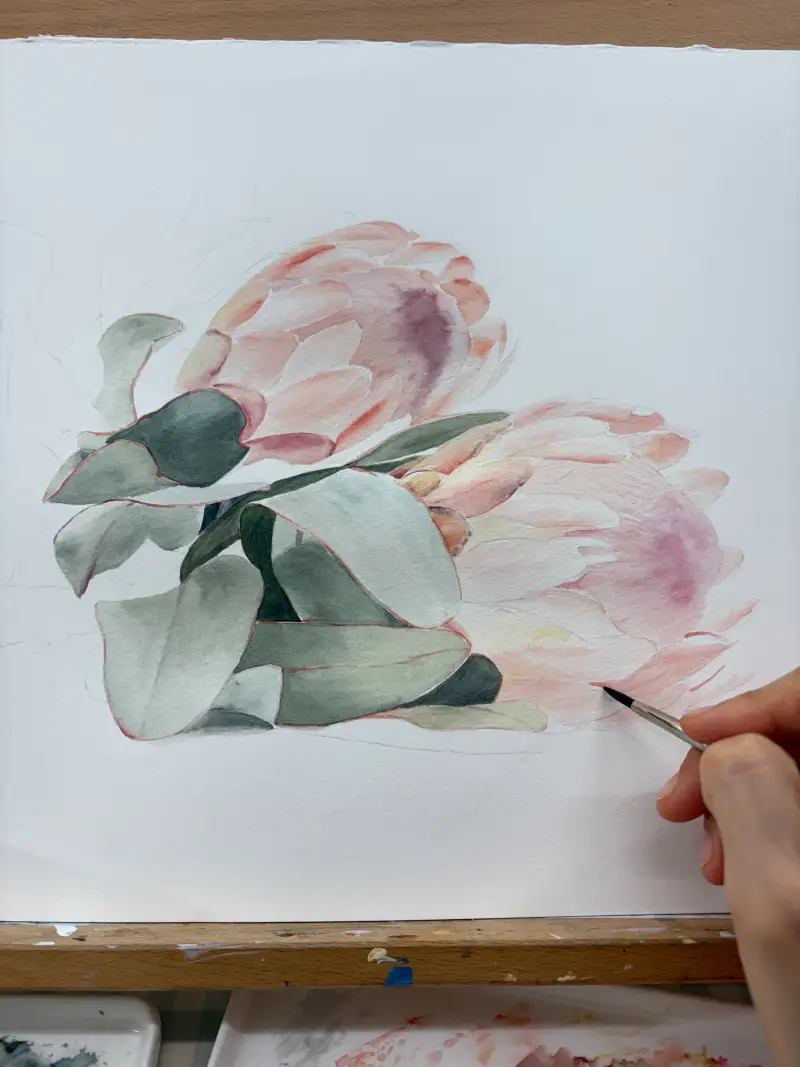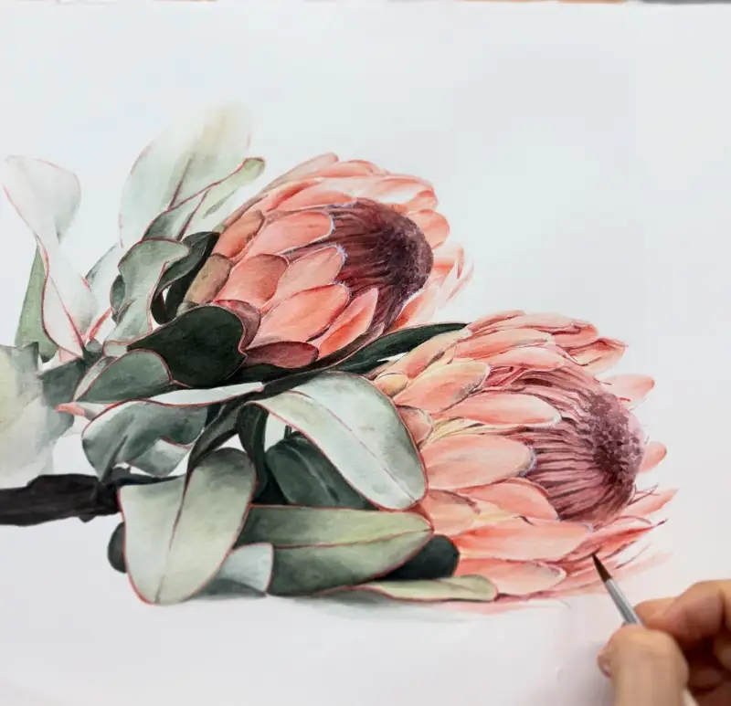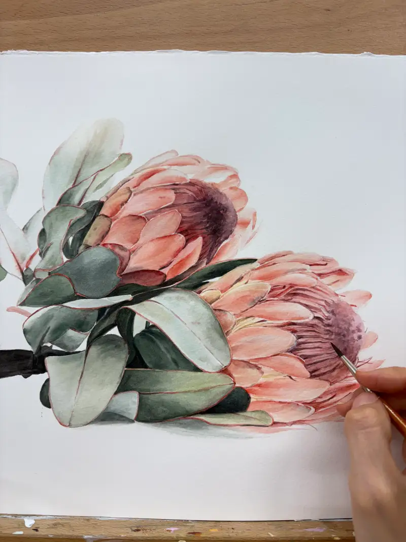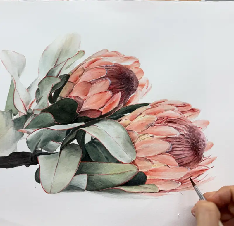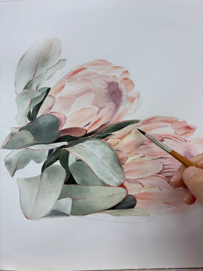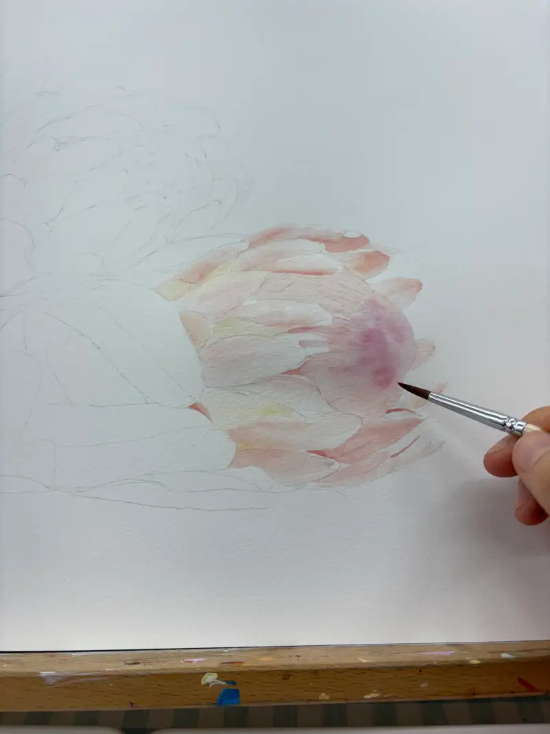 프로테아 꽃잎의 겹겹이 쌓인 표현할 때, 안채색의 장점이 가장 잘 드러났어요. 세목종이에 안채색 상주를 여러 번 덧칠해도 탁해지지 않고 맑은 색감을 유지해주어, 꽃잎의 깊이와 투명감을 동시에 표현할 수 있었어요~