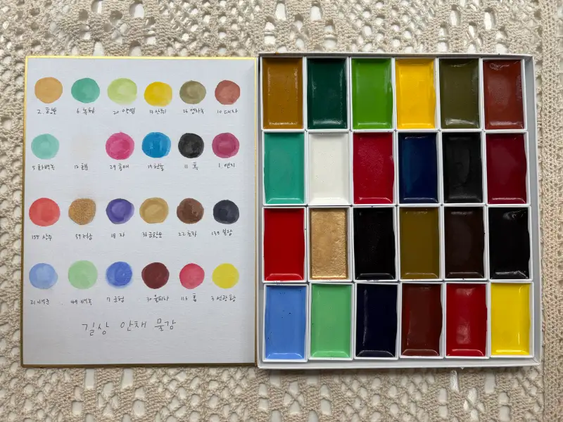 🎨이번에 사용한 재료는 전통적인 깊이를 담고 있는 채미먹과 맑고 은은한 발색이 특징인 안채색이에요.