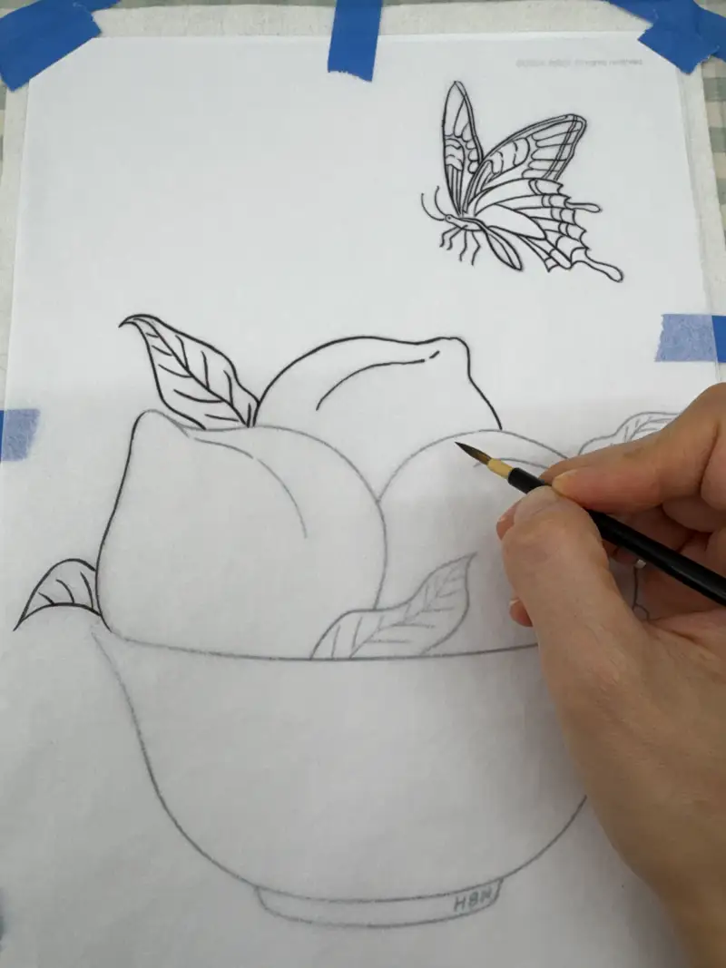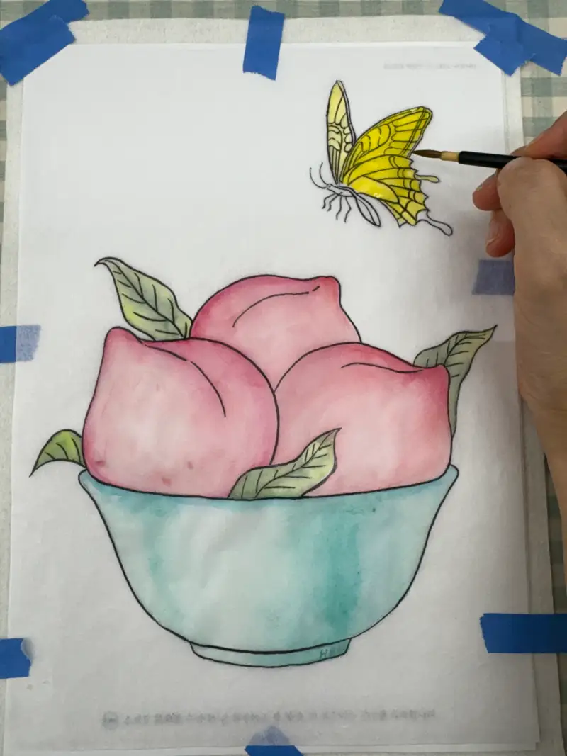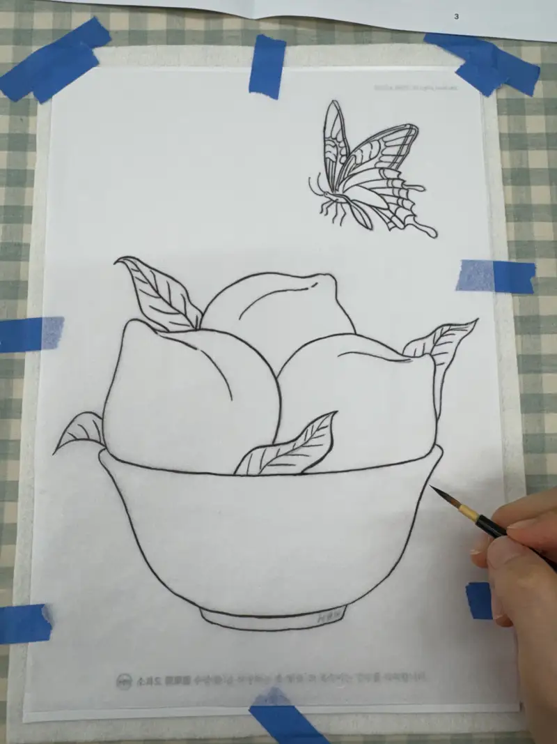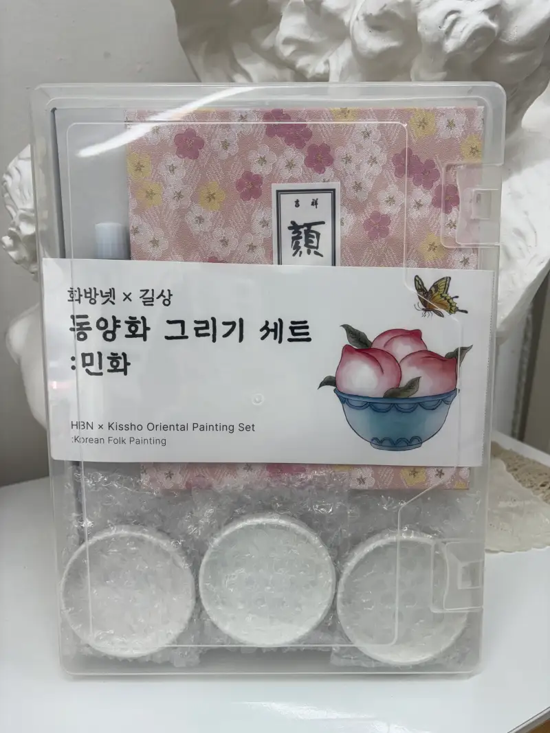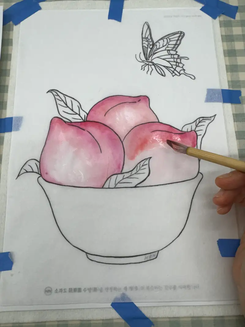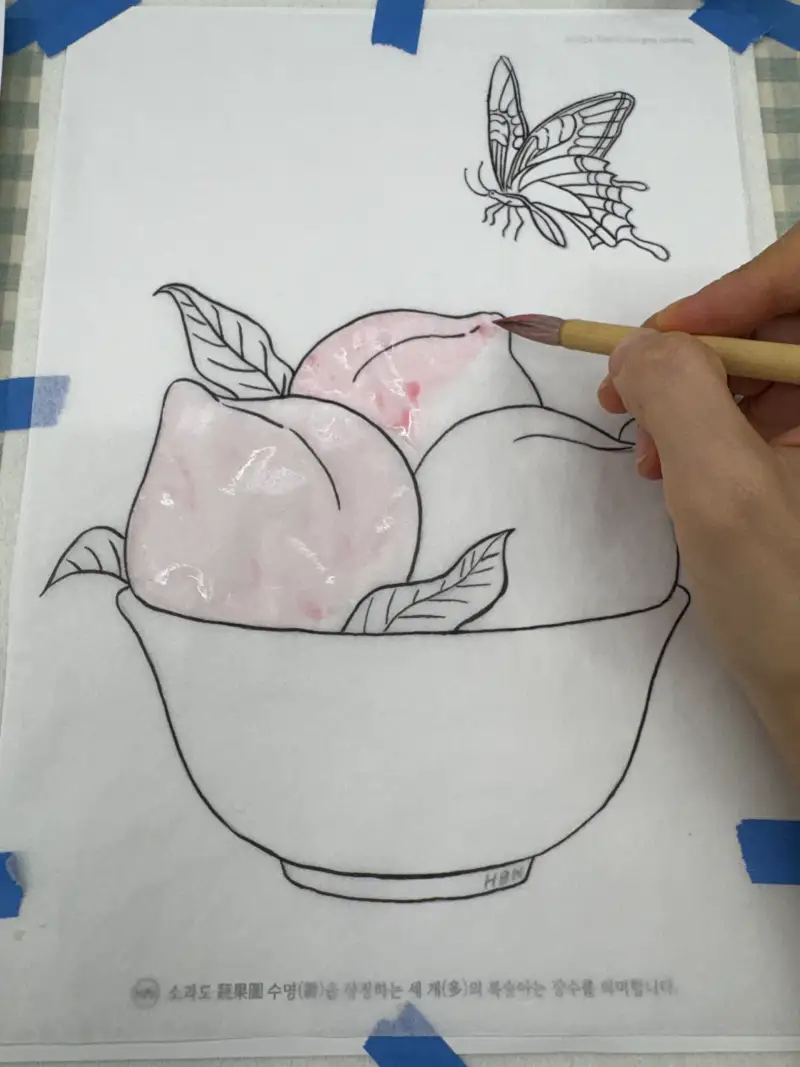 이번에는 길상 민화 세트를 활용해서 전통적인 느낌의 복숭아와 나비 그림을 그려봤어요.