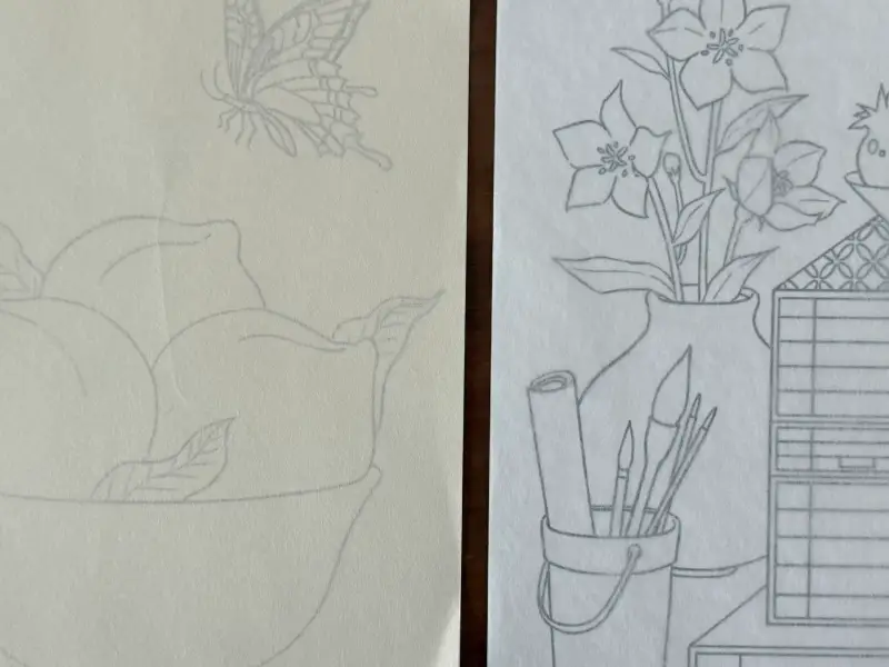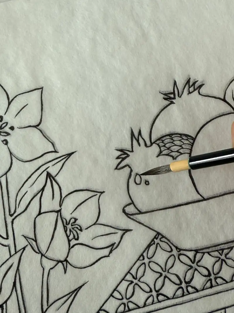 민화는 스케치를 아래에 두고 먹(물감)으로 바로 선을 따거나