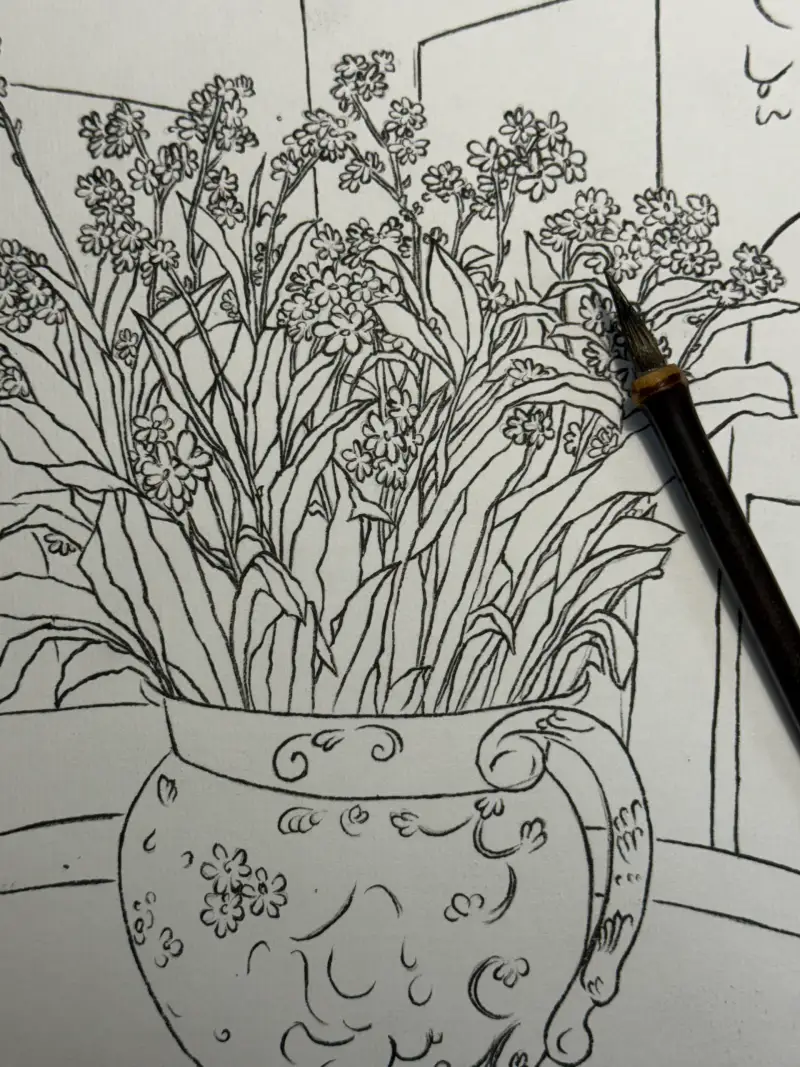 아래쪽에 도안(스케치)을 두고 바로 물감으로 선을 따주면 돼요.