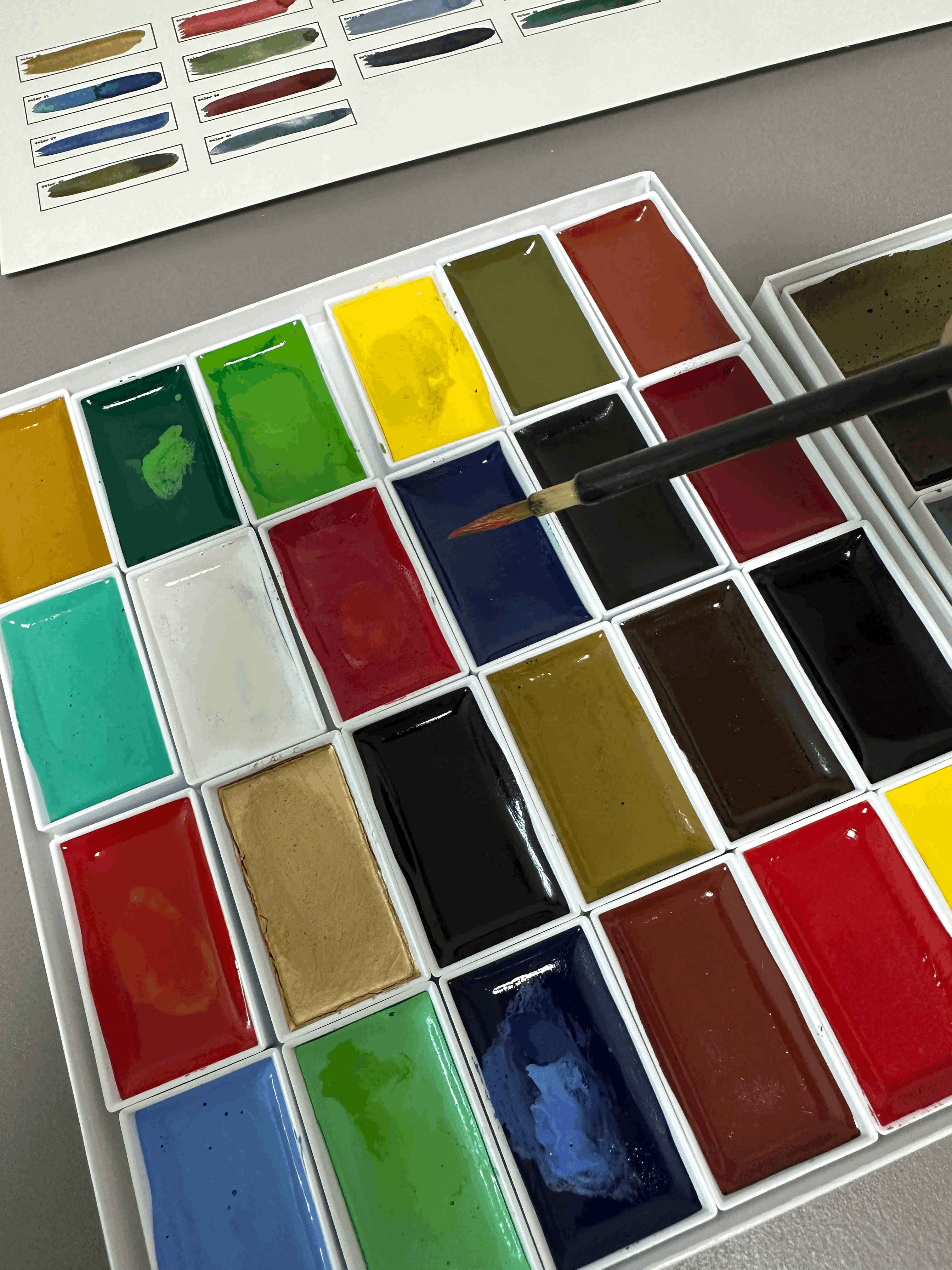 물감은 단단하지만 붓에 물을 적셔 쓰면 발색이 선명하게 올라왔습니다.
