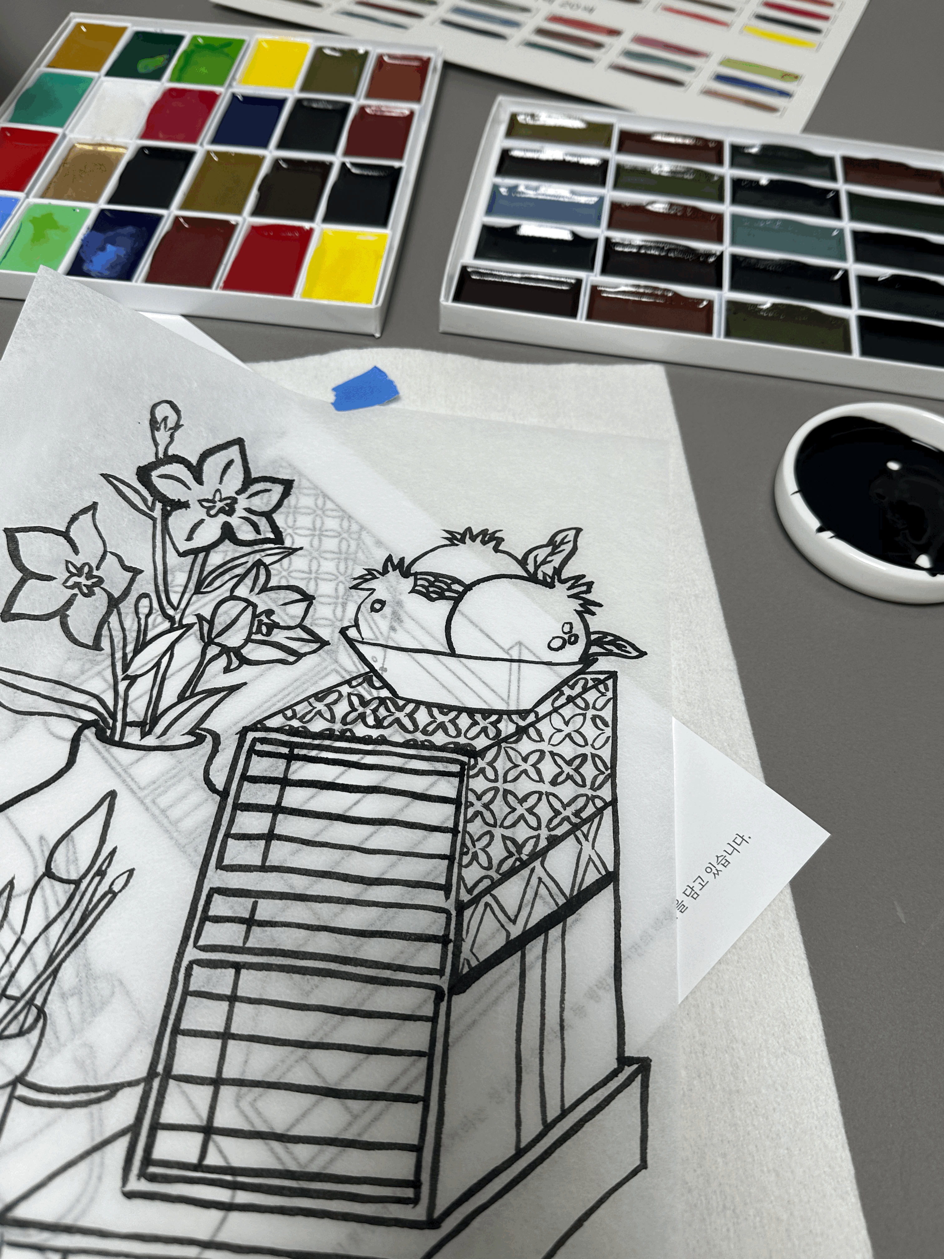 이번 그림에 사용한 제품은 길상 x 화방넷 동양화 그리기 세트: 민화 ,길상 채미먹 안채 접시 고체 물감 20색 세트 입니다.