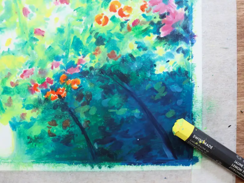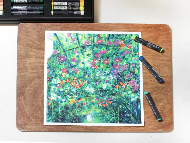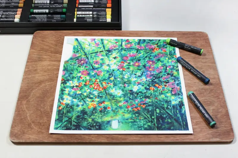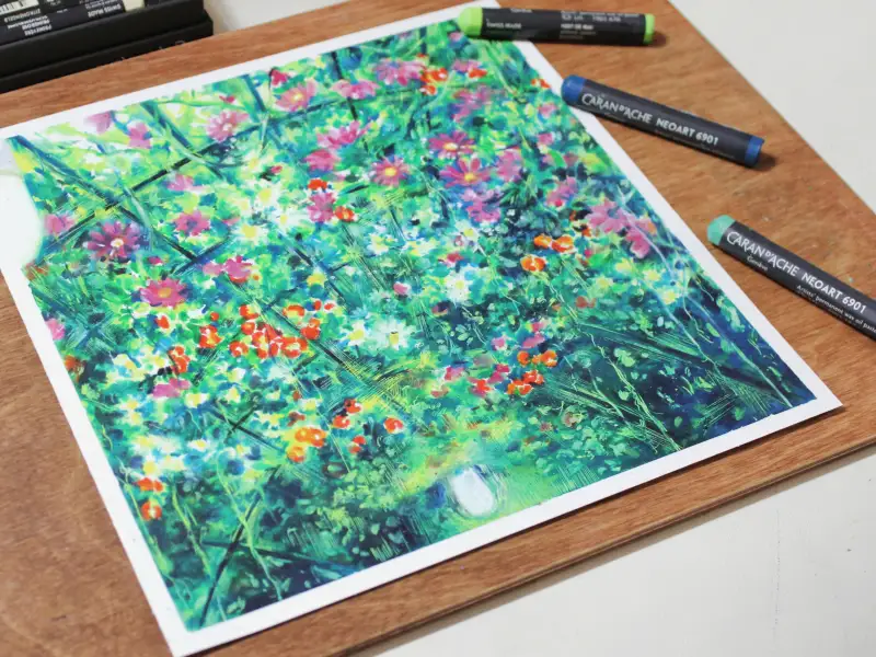 네오아트 왁스오일파스텔은 맑게 레이어링 되는게 특징이라 밑색에 영향을 많이 받아 꽃이 들어갈 부분들은 비워두면서 가볍게 칠했습니다😊