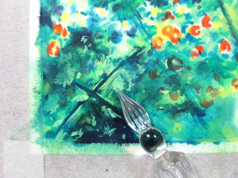 이제 날카로운 도구로 스크래치 기법을 시작하는데, 저는 집는 유리딥펜을 사용했습니다.