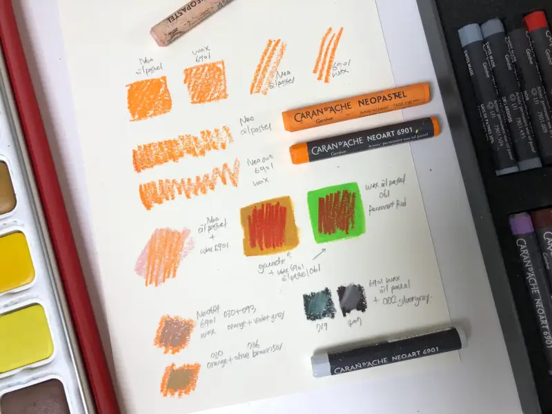 처음엔 두 재료를 각각 그려봤고  그 아래에는 오일파스텔 위에 6901 왁스 오일파스텔을 올리거나