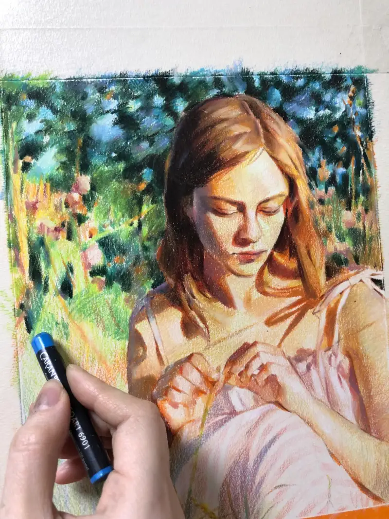 사용했는데, 왁스 오일 파스텔 위에 올라가진 않고 자연스럽게 묻혀서 부드럽게 표현됩니다.