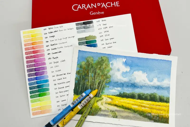 까렌다쉬 네오칼라 수성 크레용은 물을 칠한 후 발색도 쨍하고 날아가는거 없이 처음과 같아요