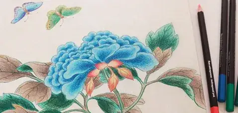 까렌다쉬 수채색연필로 그린 모란꽃과 나비 화접도