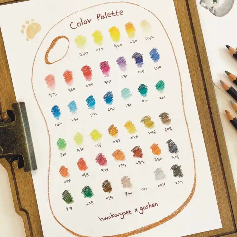 발색표를 보면 까렌다쉬 답게 고급스러운 색이 정말 많아서, 초록색과 갈색 계열을 주로