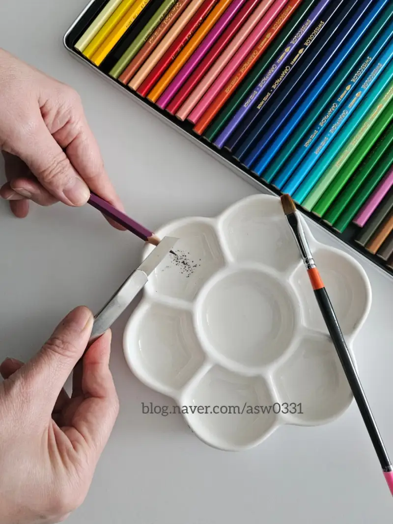 물기가 마르니 역시 좀 더 연해지네요. 색연필 심을 간 다음 물을 섞어서 좀 진한 부분에 칠해볼게요.