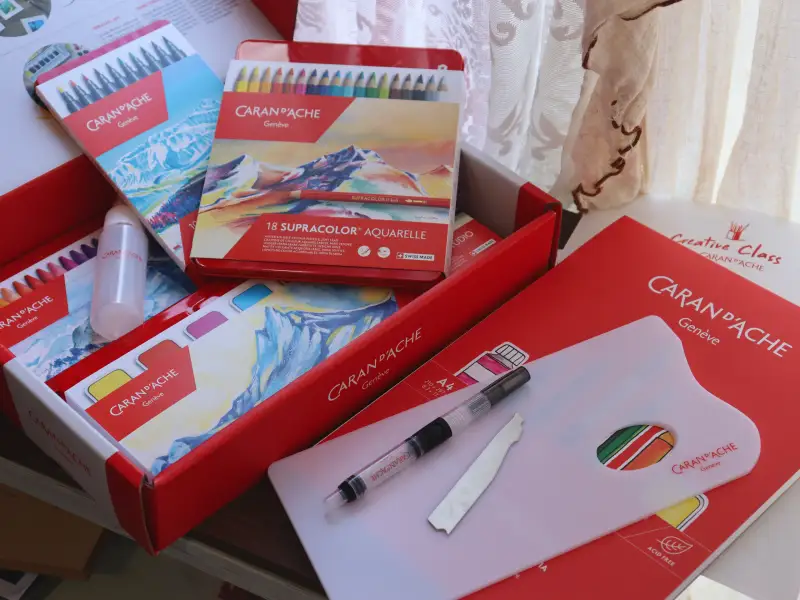 구성품: 피브라로 브러쉬 10색 / 수프라컬러 수성 색연필 18색 / 네오컬러2 30색 / 스튜디오 과슈 8색 / mixed media패드 A4 / 워터브러쉬 / 스프레이 / 스크래퍼 / 플랙시글라스 팔레트