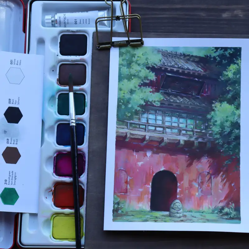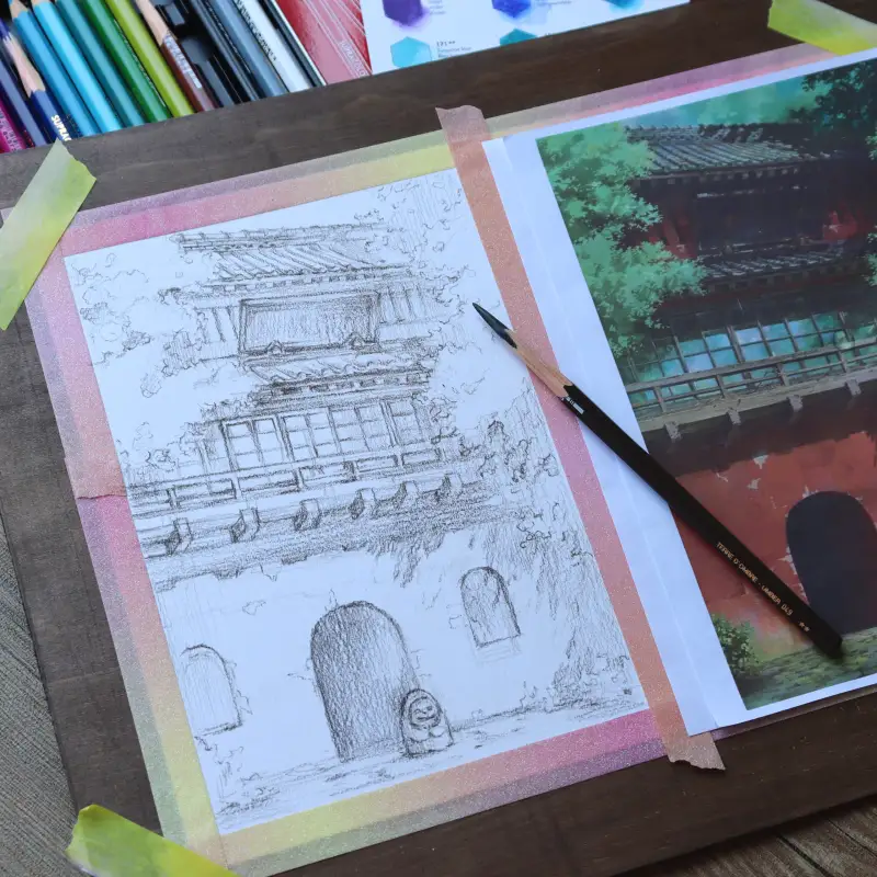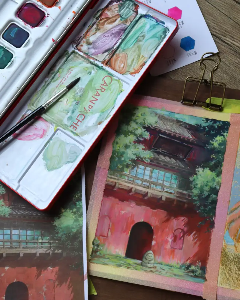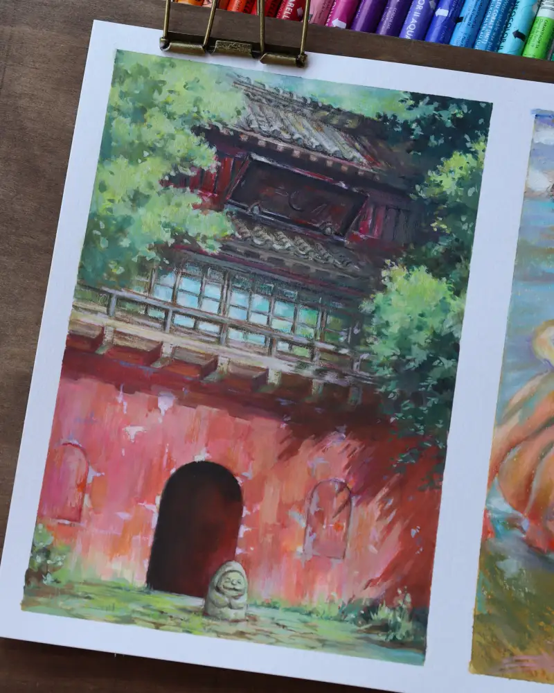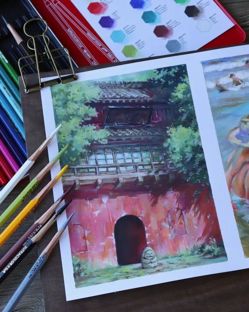 첫 번째는 까렌다쉬 mixed media 패드 위에 수프라컬러 수성 색연필 + 스튜디오 과슈 조합으로 그린 지브리씬🌿