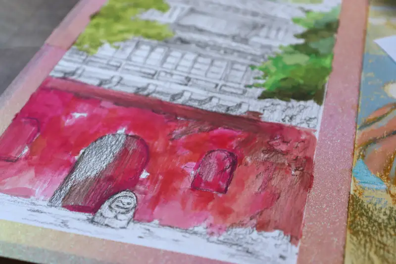 저는 날렵한 색연필심이 세필붓보다 편해서 넓은 면적을 먼저 과슈로 채색 후 지붕과 창문처럼 복잡한 부분을 색연필로 묘사했어요.(인스타 게시물에 짧은 영상을 함께 올려놨어요😘)