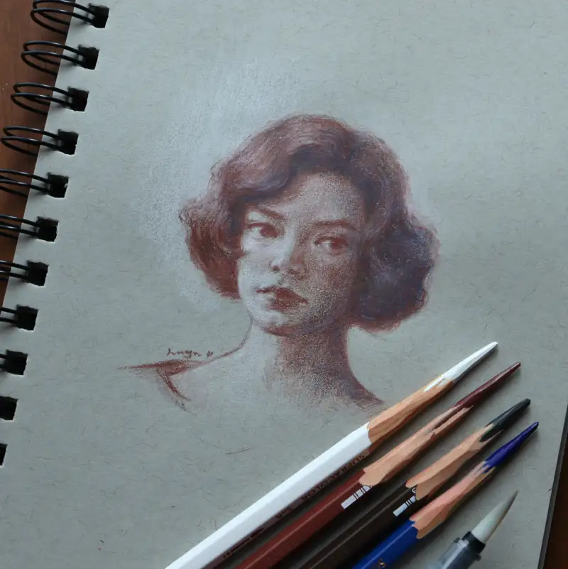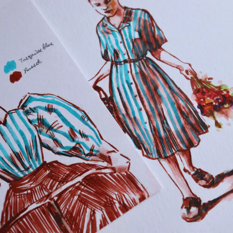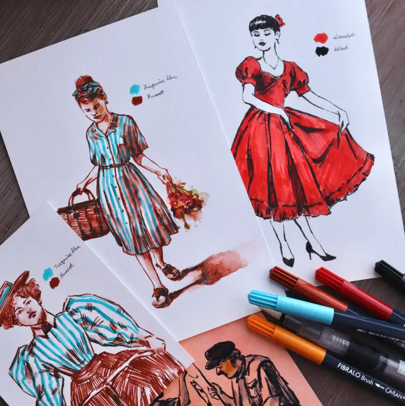 처음에 터쿼이즈+러셋 조합으로 빈티지 북 표지에 있던 그림을 그렸다가 색 조합이 마음에 들어서 인물 드로잉에도 적용해 보았어요.