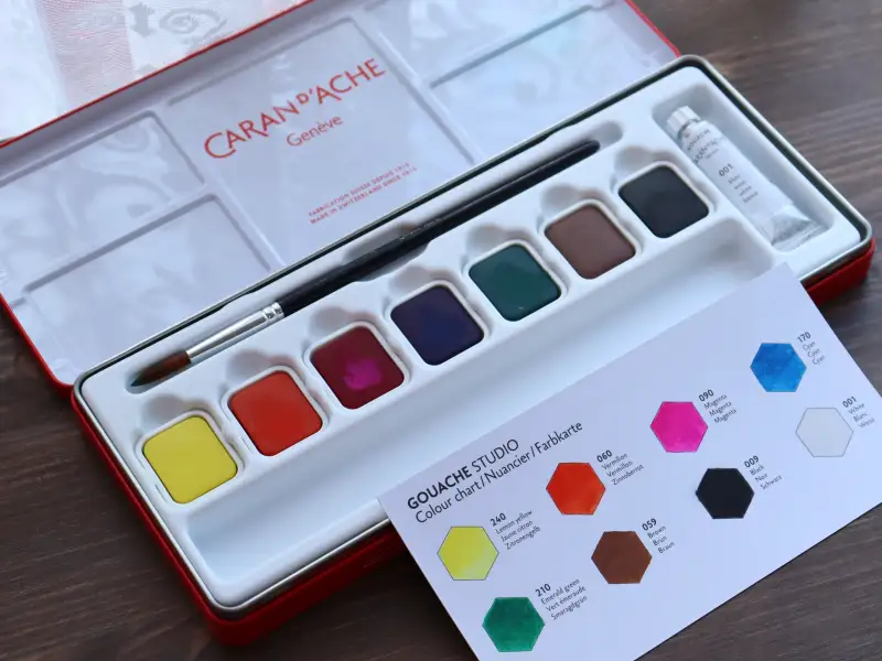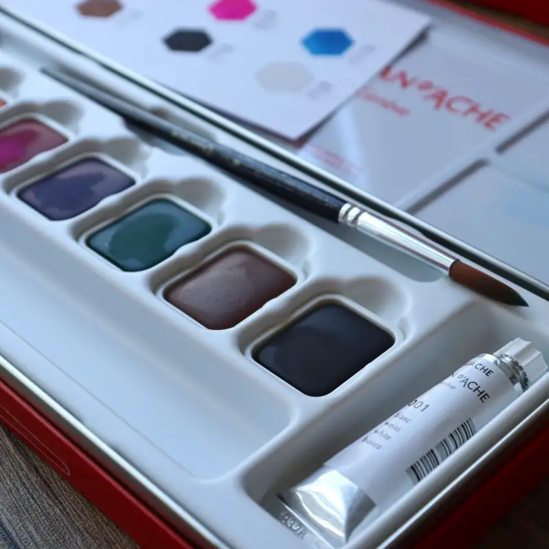 화이트 튜브 포함 총 8색이 들어있는 고체타입 과슈로 가소제 없이 자연 식물 기반의 바인더로 만들어진 제품이에요. 까렌다쉬 과슈는 페인터즈 활동하며 사용해본 과슈 중에서 가장 맑은 느낌이었어요.