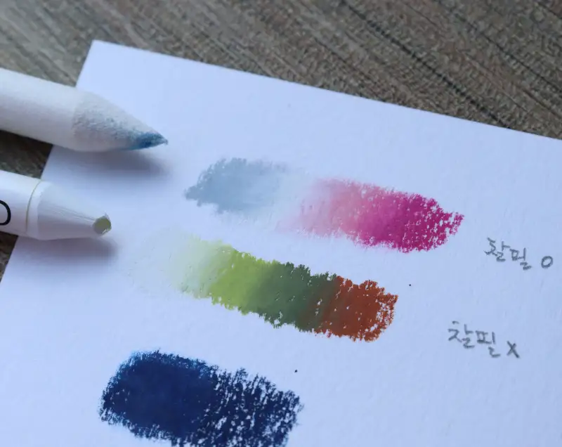 종이 결 사이사이를 메꾸며 블렌딩할 수 있는 찰필을 함께 사용했는데 비슷한 명도, 채도의 색상은 찰필 없이도 블렌딩이 자연스러웠어요.(약간 서걱거리며 밀리는 색도 있었는데 색상마다 조금씩 차이는 있는 것 같아요)