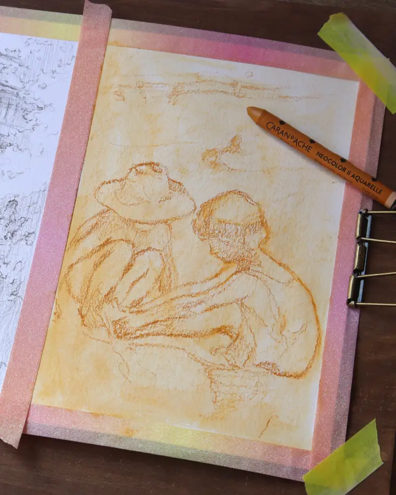 먼저 오커 색상을 깔아주고 워터브러쉬로 전체 밑칠 후 스케치했어요. 아래 사진들처럼 색을 조금씩 쌓아가며 채색했고 넓은 부분은 워터브러쉬를 사용해 블렌딩 해주고 마무리로 크레용을 플랙시 글라스 팔레트에 갈아 과슈처럼 사용해 묘사!