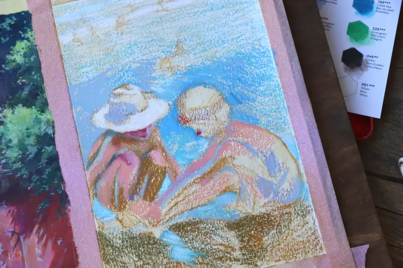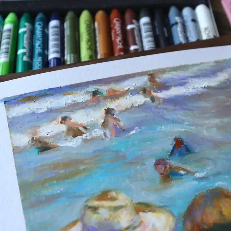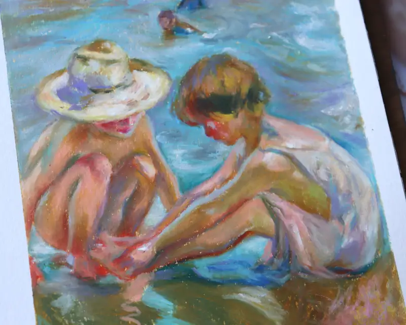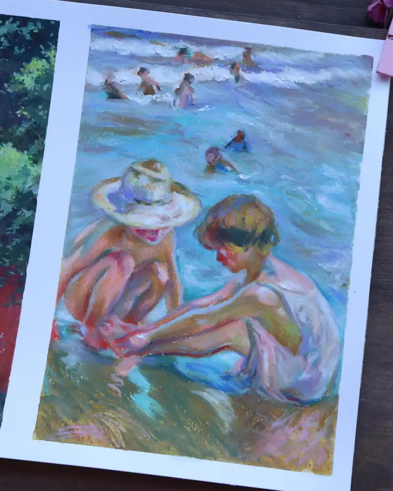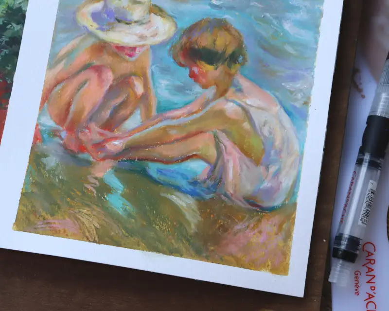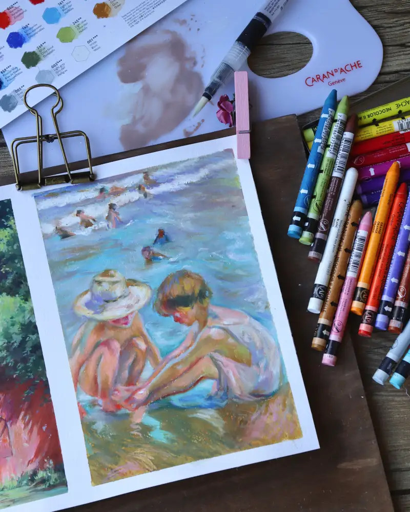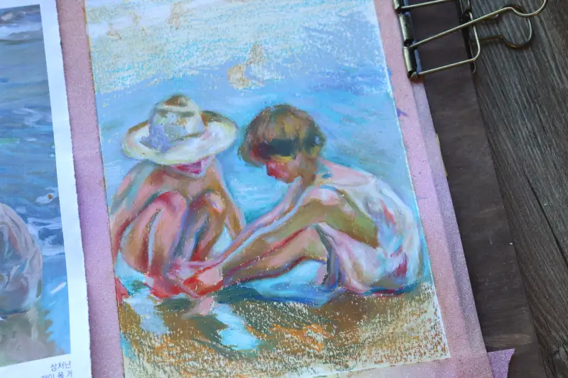 두 번째는 네오컬러2 크레용을 사용해 그린 호아킨 소로야의 바닷가 그림이에요. 상처난 발을 만지고 있는 아이와 걱정해주는 밀짚모자 친구🥺