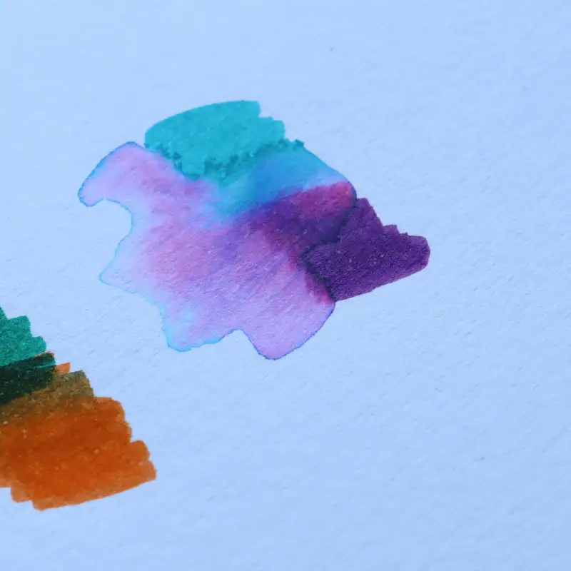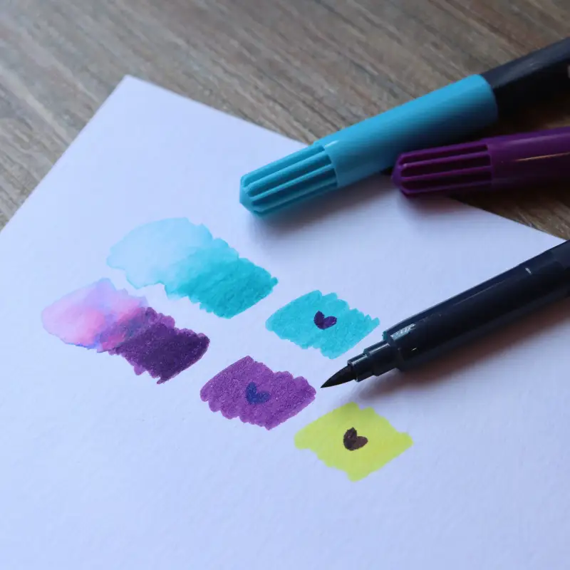 물에 번지는 느낌이 정말 예뻤고 초딩시절 싸인펜이 떠오르는 색감이었어요. 브러쉬는 약 3년 동안 마르지 않는 최상의 퀄리티로 선명한 색상을 오랫동안 사용 가능해요.