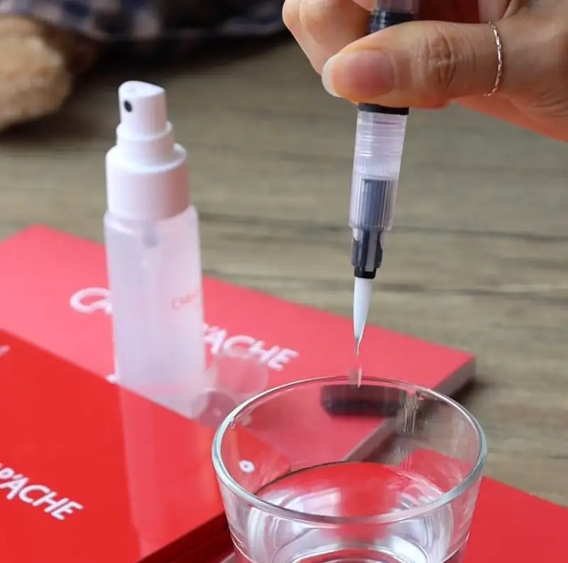 충전 후 옆 면의 push 버튼을 눌러 물의 양을 조절해 간편하게 수채 효과를 줄 수 있고 적당한 탄력의 붓모로 부드럽게 그려져서 좋았어요.