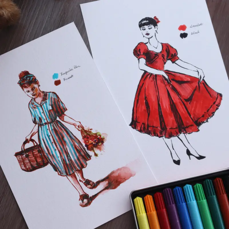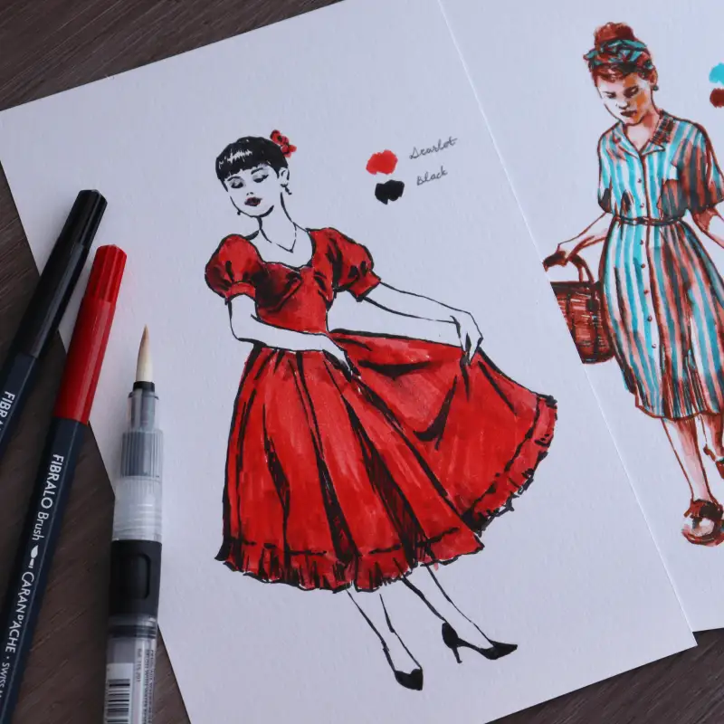 스칼렛+블랙 조합의 빨간 드레스는 브러쉬를 눕혀서 넓은 면을 빠르게 채워주었고 서로 다른 색상이 겹쳐도 지저분하게 번지지 않아서 좋았어요.