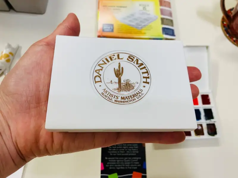 다니엘스미스 고체수채화물감 케이스를 보면 금테두른 로고가 럭셔리한 느낌이..