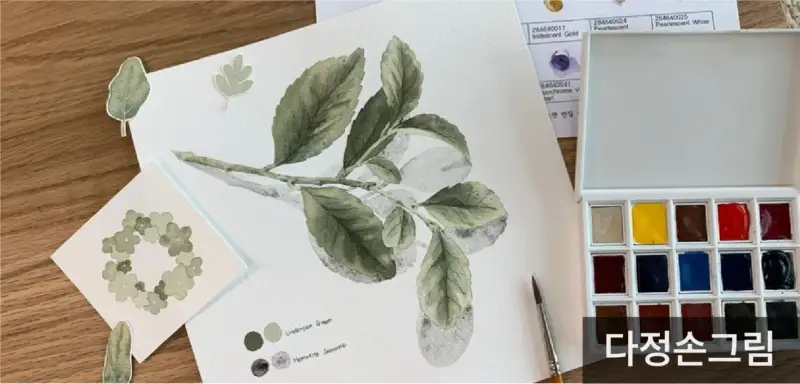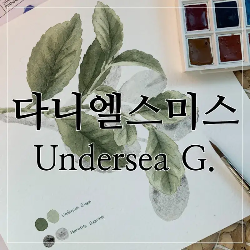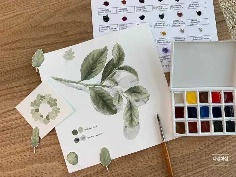 두가지 색상을 섞어서 사용해보고 싶었는데 각자 따로 사용했을 때 어떤 결과물이 나올까 궁금해서 일부러 초록잎은 언더씨 그린만, 그림자는 헤마타이트 제뉴인만으로 그려보았어요.