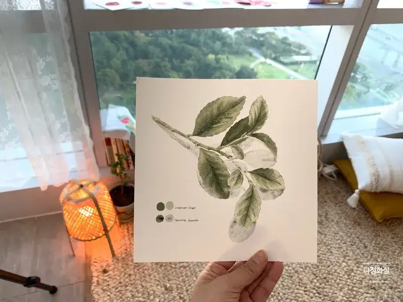 초록이파리는 모두 언더씨 그린 한가지 색상으로만 그렸어요. 신기한게 분명 한가지 색으로 그렸는데 마르고 나면 두세가지 색상이 나요!