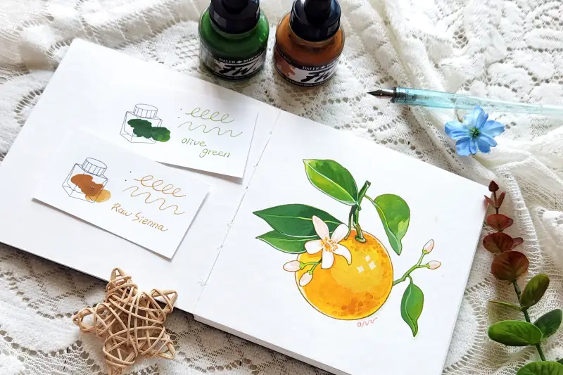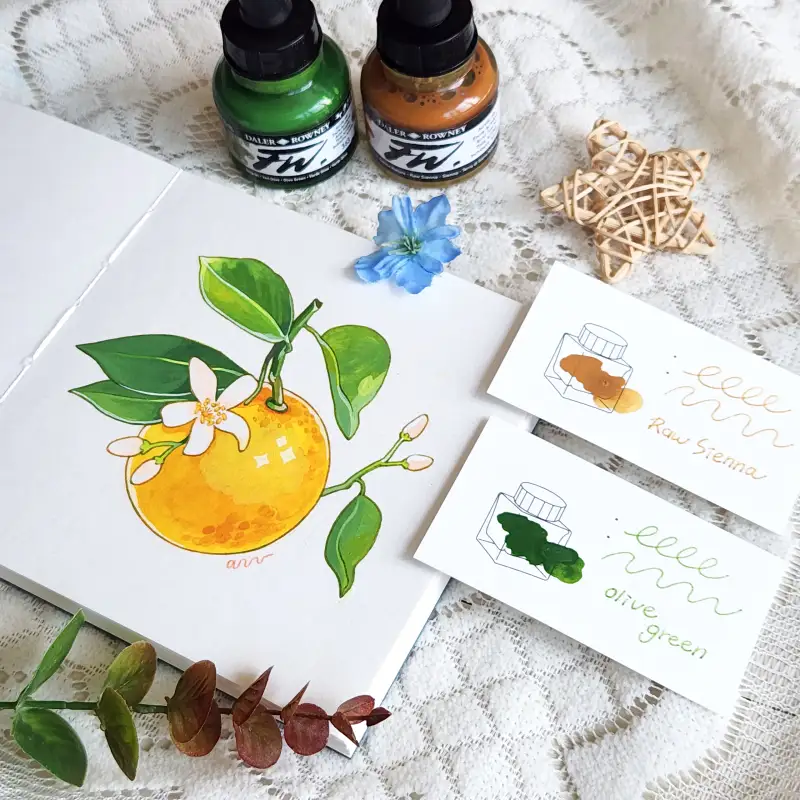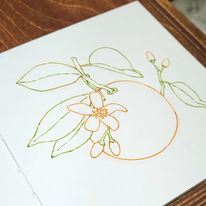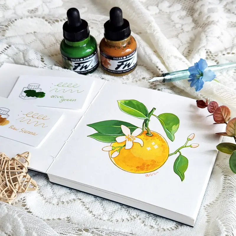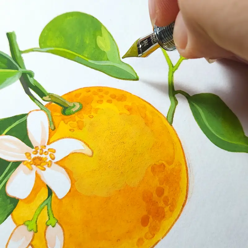 아크릴 잉크와 딥펜으로 오렌지 라인을 그려주고