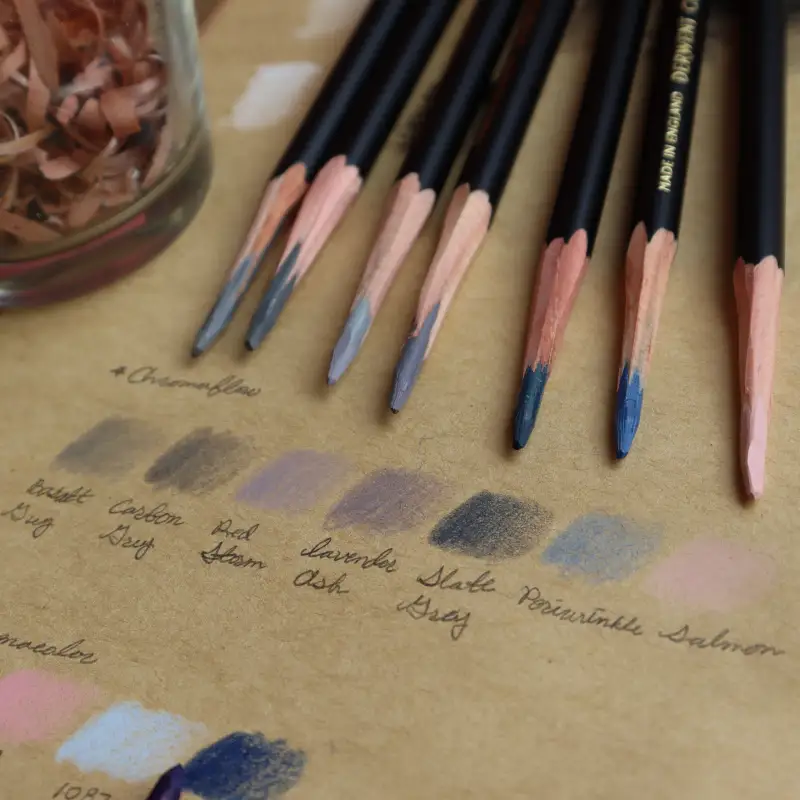 귀여운 틴케이스에 들어있는 더웬트 크로마플로우는 심 두께 3.5mm의 왁스 기반 색연필이에요.