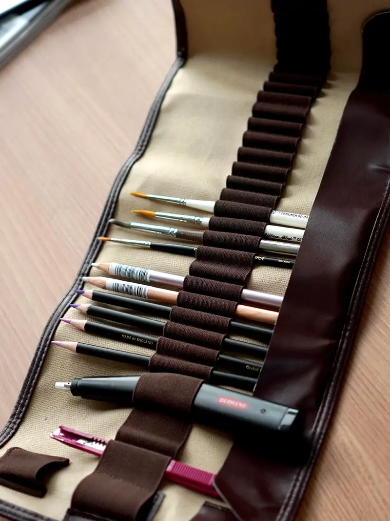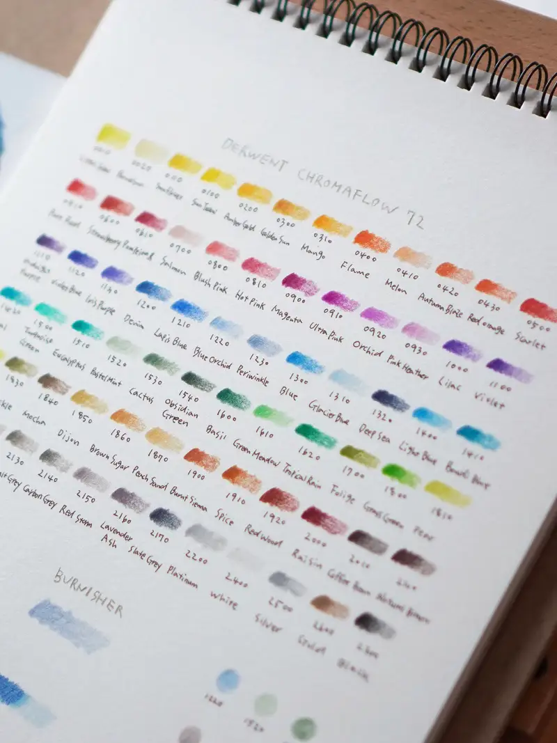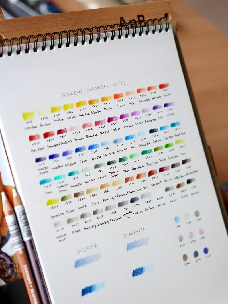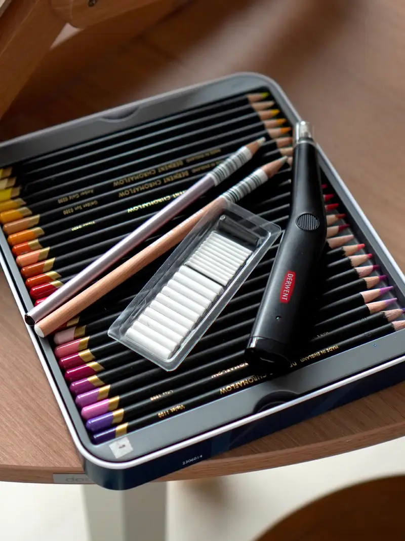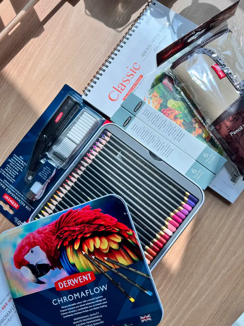 더웬트 크로마플로우 72색 유성 색연필과 보조 재료들